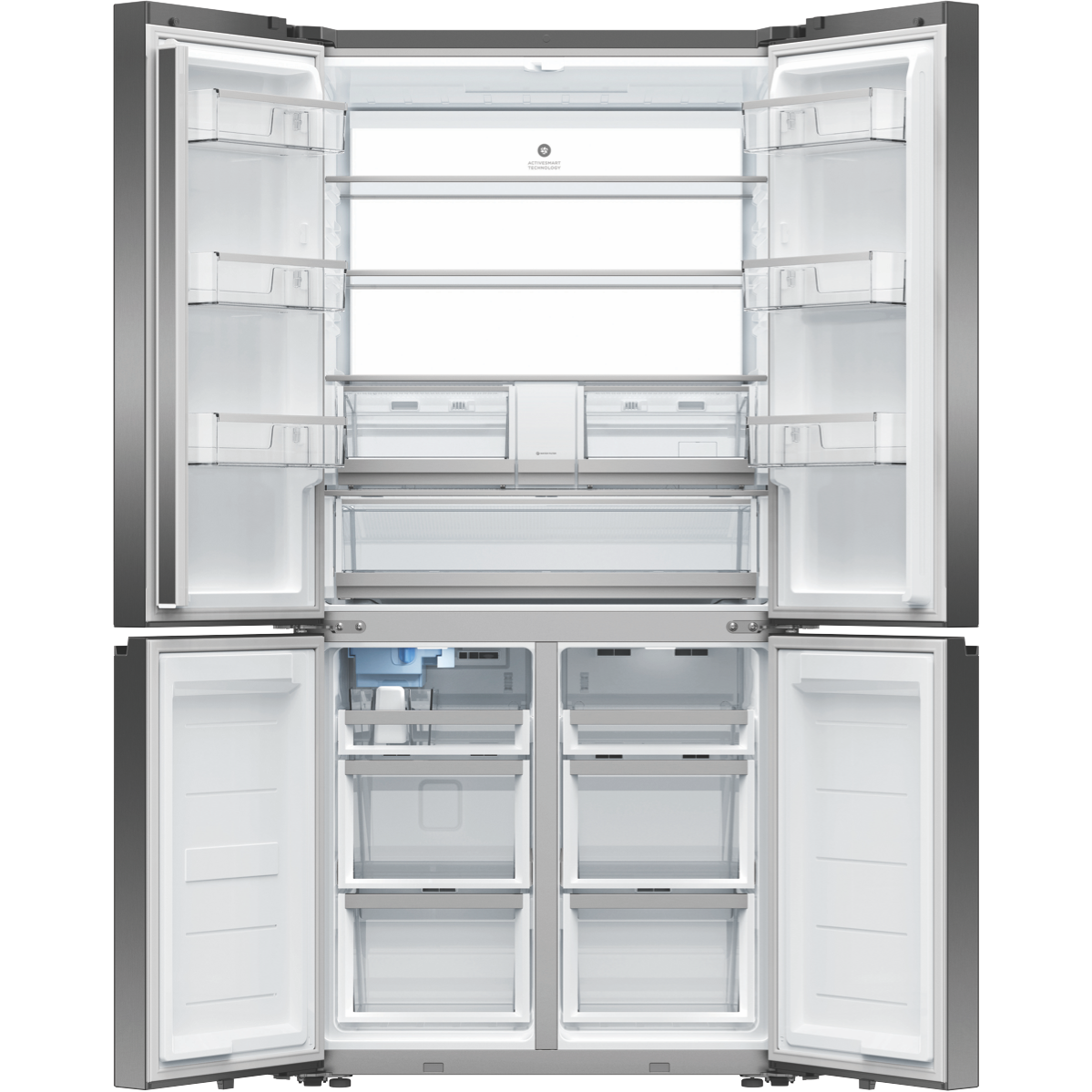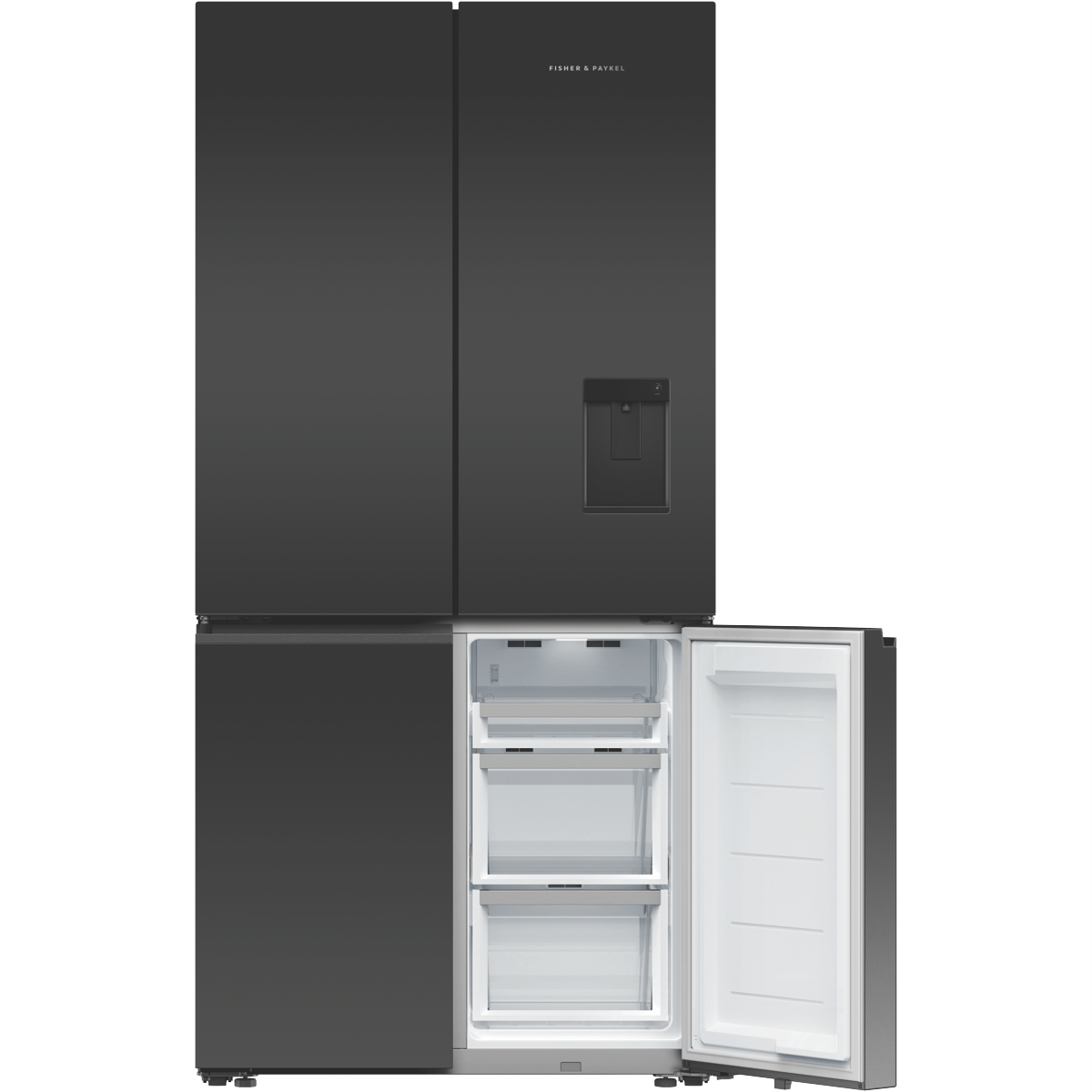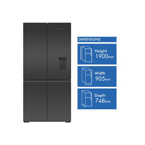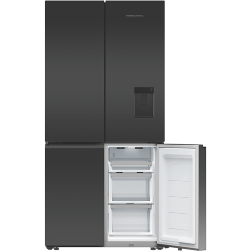 Step up to smart convenience with the Fisher & Paykel 690L Quad Door Refrigerator. This spacious French door fridge provides ample storage for the whole family's fresh food needs. The sleek matte black glass finish and black exterior lend an ultra-modern look while the generous 690 litre total capacity equips you with expansive refrigerator and freezer space. Keep frequently used items right at hand thanks to the quad door design which includes two fridge doors and two freezer drawers. Adjustable storage multiple temperature zones and ActiveSmart technology all help ensure your food stays fresher for longer. Additional useful functions like fast ice making a water dispenser soft freeze mode and chill mode make everyday life easier. Discover the difference smart refrigeration can make - this Fisher & Paykel fridge offers modern style and innovative food care in one brilliant appliance. The manufacturer's part number for this product is RF730QZUVB1.
