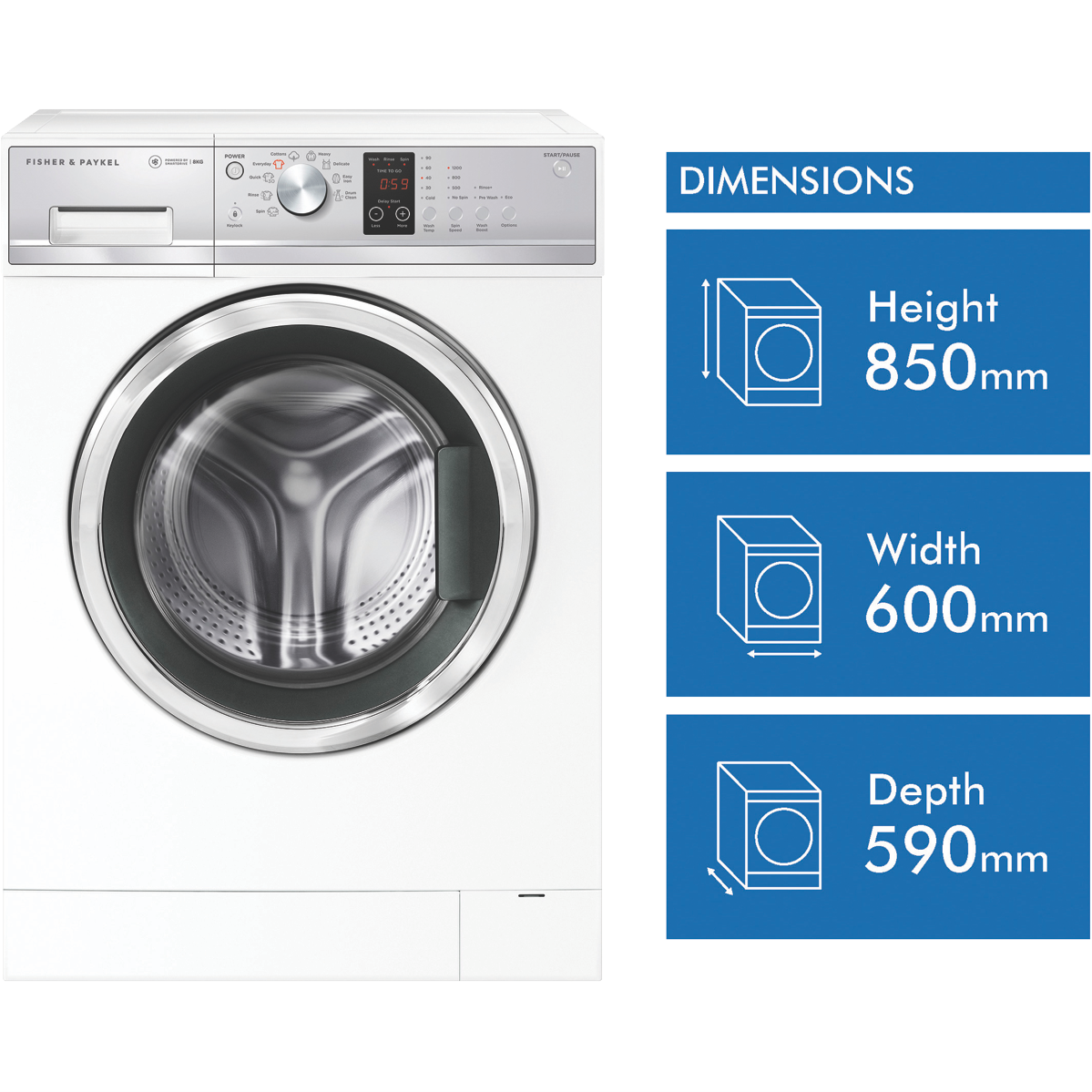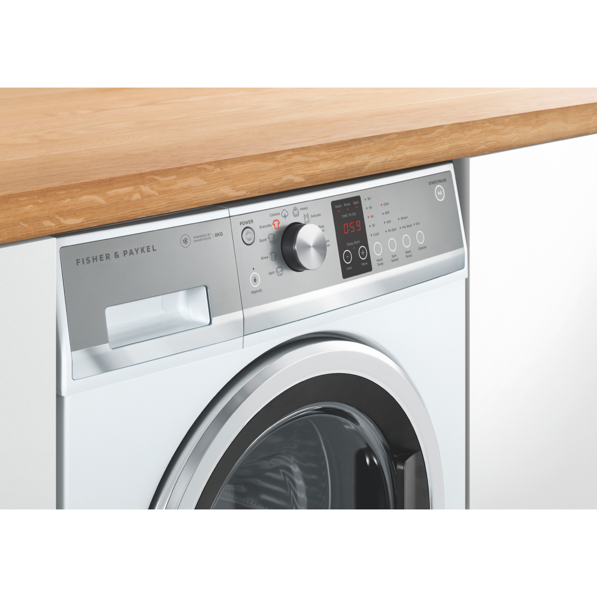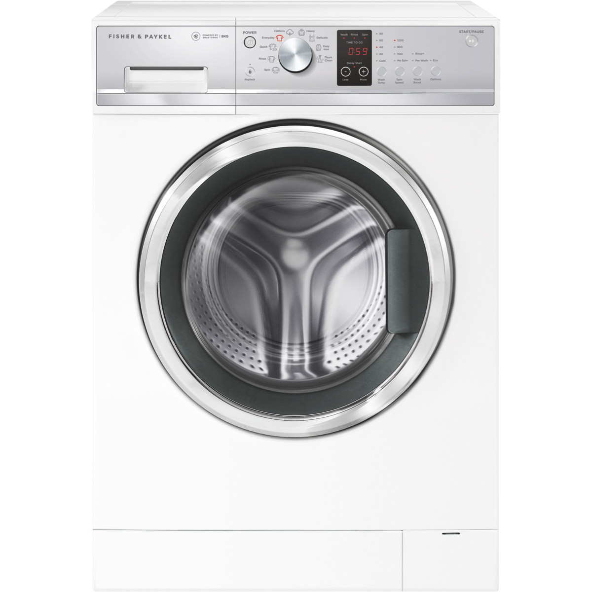 Introduce efficiency into your laundry routine with the Fisher & Paykel 8kg Front Load Washer. This white washing machine's Direct Drive motor and 1200rpm spin speed make quick work of all your washing needs. With a 4.5 star WELS water rating and 4 star energy rating you can cut back on water and electricity usage while still getting a thorough clean. The SmartDrive Technology delivers quiet reliable washing for medium to large loads. With 9 customisable wash programs like Everyday Heavy Delicate and Eco you have full control over every load. The intuitive SmartTouch control dial also enables you to easily adjust wash temperature spin speed pre-wash and extra rinse options. The durable stainless steel drum gently but effectively cleans your clothes while preventing corrosion over time. Plus the matching DE8060P2 dryer completes your laundry duo. Bring home the Fisher & Paykel for a modern washing machine that will make laundry simple for years to come. The manufacturer's part number for this product is WH8060J3. Discover efficiency durability and customisation with this front load washer today.