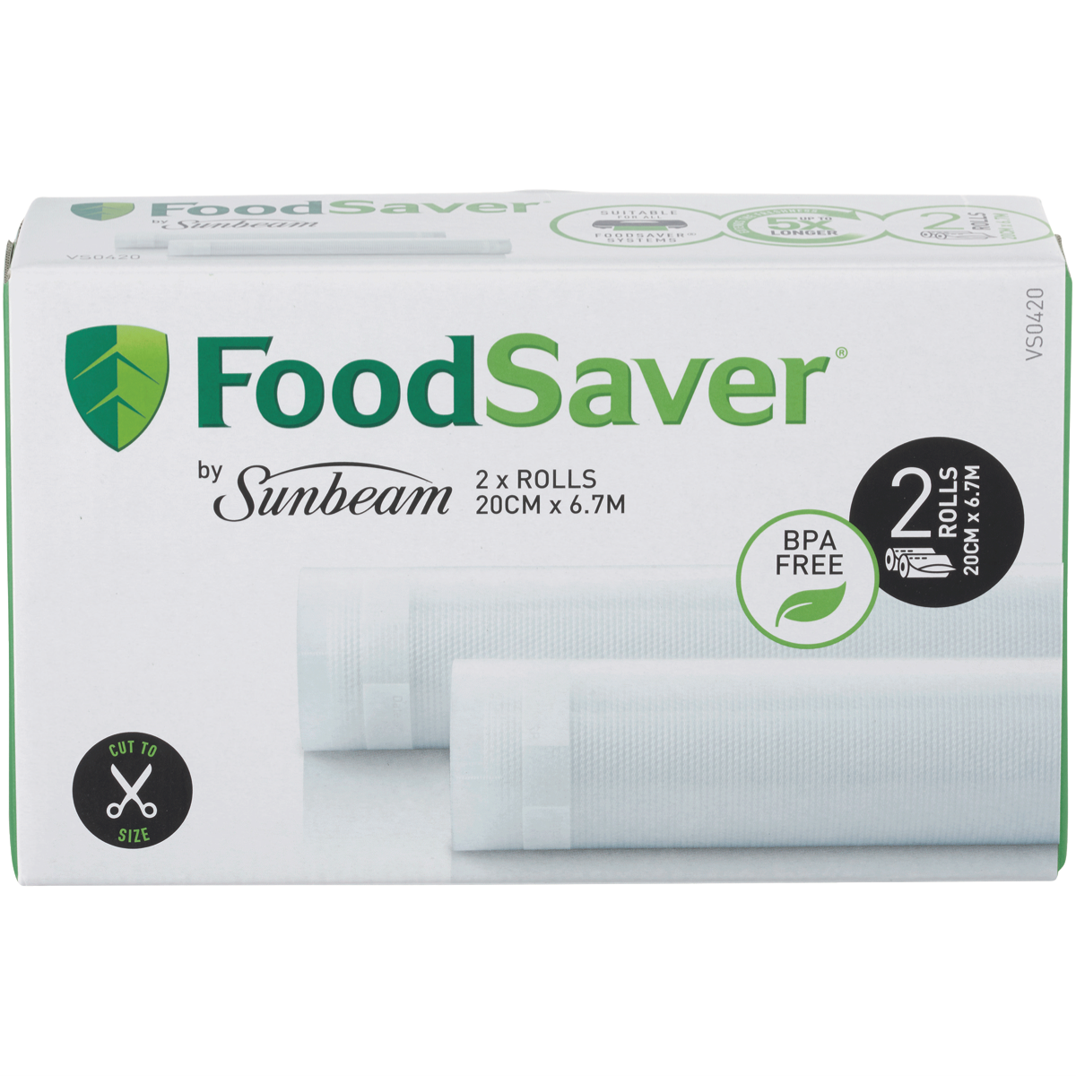Seal in freshness and lock out freezer burn with the FoodSaver Vacuum Bag Roll 2 Pack. This kitchen essential allows you to portion and prepare meals in advance so you can spend less time cooking each night. The 20cm wide bags are designed to fit a variety of foods from meats and seafood to leftovers and vegetables. Simply place your ingredients in the bag insert the open end in your FoodSaver appliance and let it remove the air before sealing shut. The airtight vacuum seal keeps food fresh up to five times longer by preventing oxidation and freezer burn. With the convenience of ready-to-use bags you can spend more time enjoying delicious home-cooked meals with your family instead of worrying about food waste. Stock up on these FoodSaver bags so you always have extras on hand for sous vide cooking marinating and freezing. Their BPA-free multilayer construction ensures a secure durable seal you can trust to maintain food quality. Start getting more out of your groceries and save money by reducing waste with the FoodSaver Vacuum Bag Roll 2 Pack. The manufacturer's part number for this product is VS0420.
