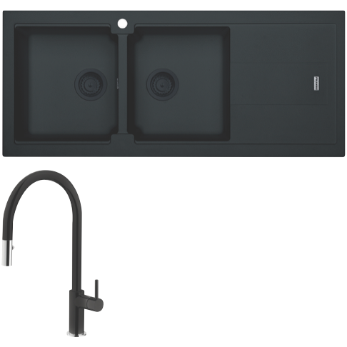 Franke Bali Double Bowl Sink with Right Hand Drainer and Verona Pull-Out Tap - Matt Black