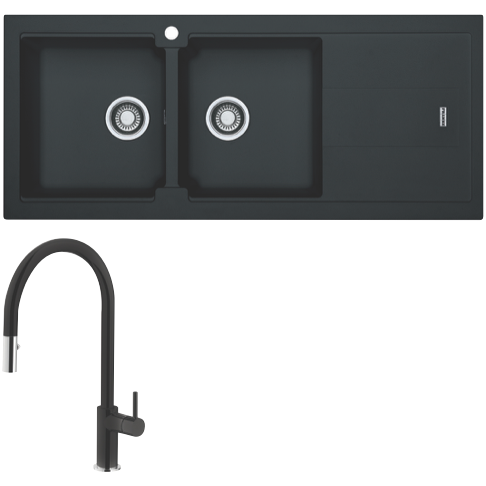 Franke Bali Double Bowl Sink with Right Hand Drainer and Verona Pull-Out Tap - Onyx