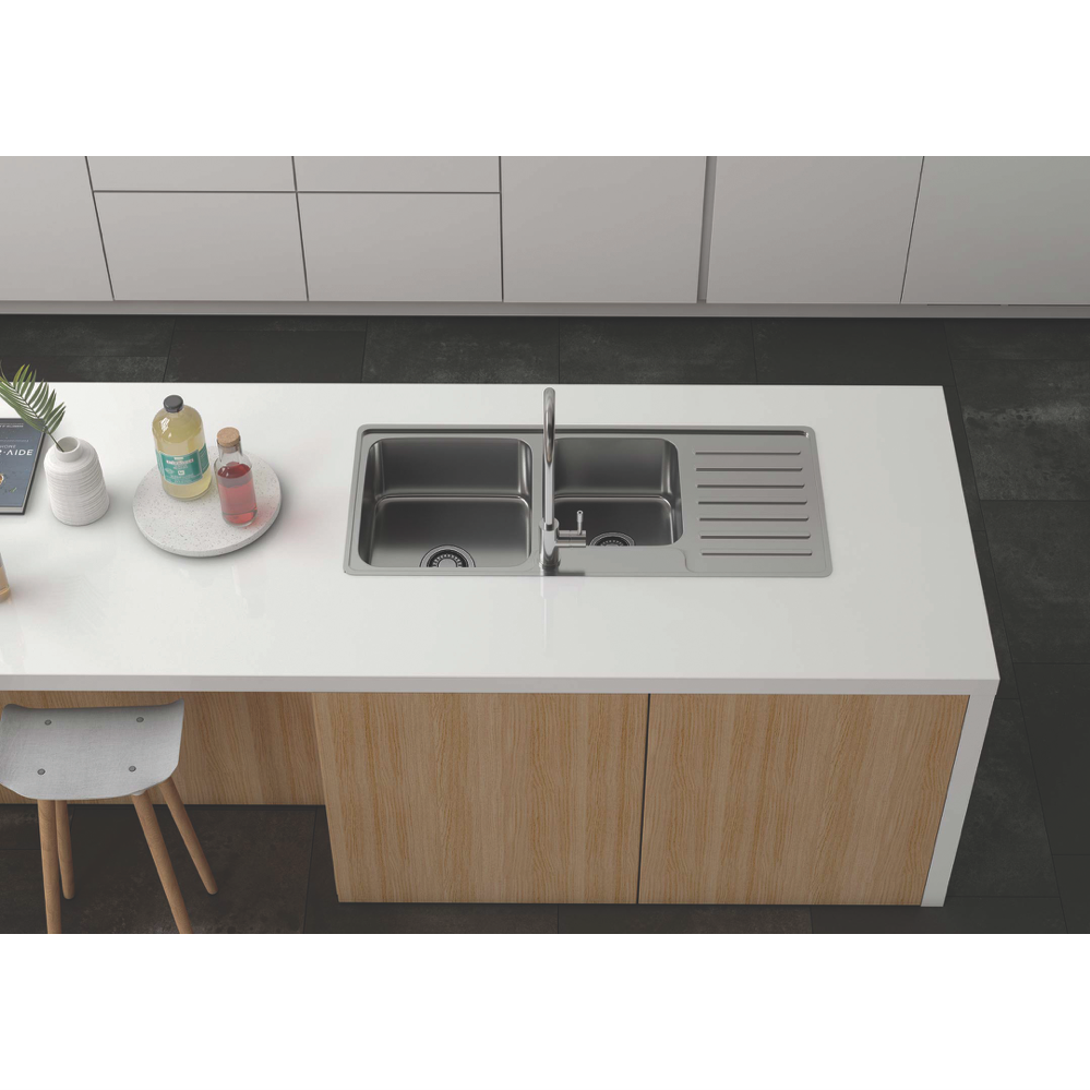 • Stainless steel double bowl with left hand drainer, 27 Litre and 17 Litre capacity