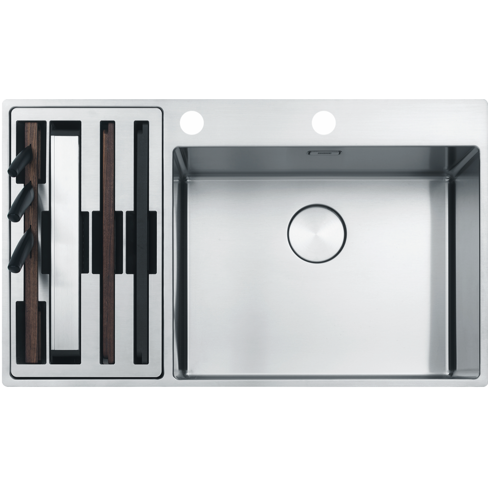 • Two tap holes, accessory hub, chopping boards, wire rack, knife set, organiser, overflow