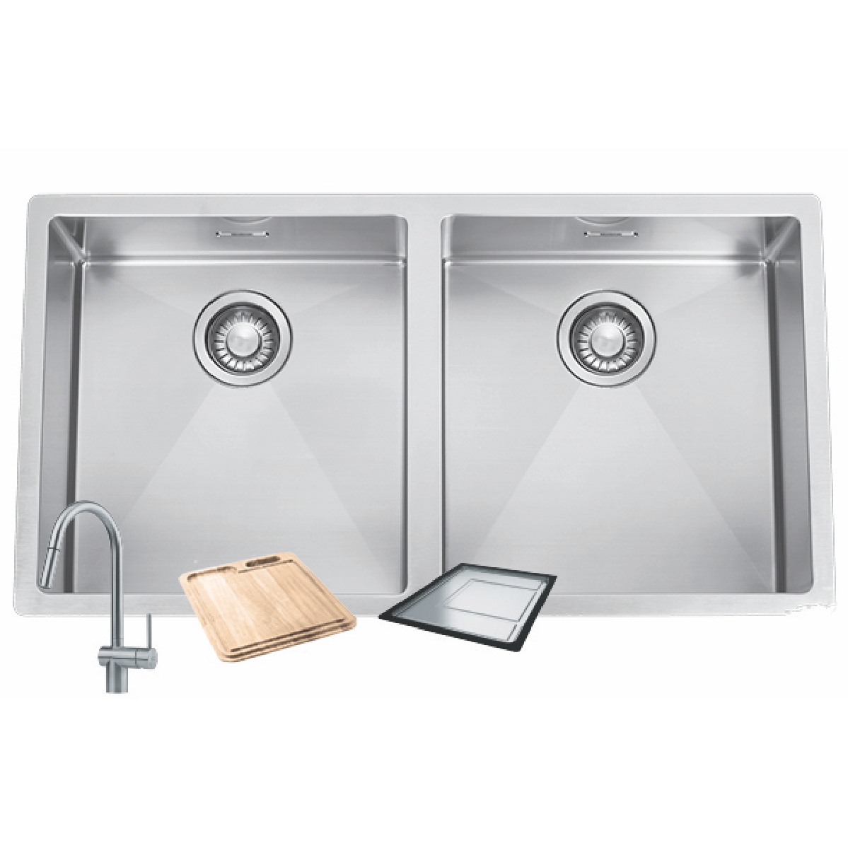 Double bowl stainless steel sink with pull out stainless steel tap including chopping board and extension drainer. This Franke Food Preparation Centre maximise the space on the benchtop making easy the food preparation and the cleaning.