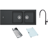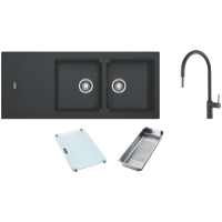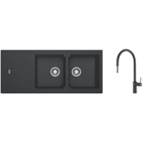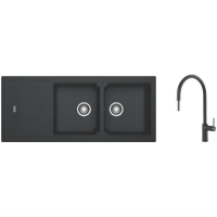 Transform your kitchen with the sleek and modern Franke Fragranite double bowl sink and tap pack. Crafted from 80% quartz sand and 20% acrylic resin this durable black sink features a stylish inset installation and reversible drainer for versatile placement. With generous 337 x 420mm double bowls you'll have plenty of room for washing dishes preparing meals and more. The included Verona gooseneck pullout tap provides a contemporary look with 5 star water efficiency using just 6 litres per minute. Everything you need for a complete kitchen upgrade in one convenient bundle. This sink and tap pack makes an excellent choice for busy cooks who appreciate smart design and everyday quality. The manufacturer's part number for this product is BLG621ONTA7311B.