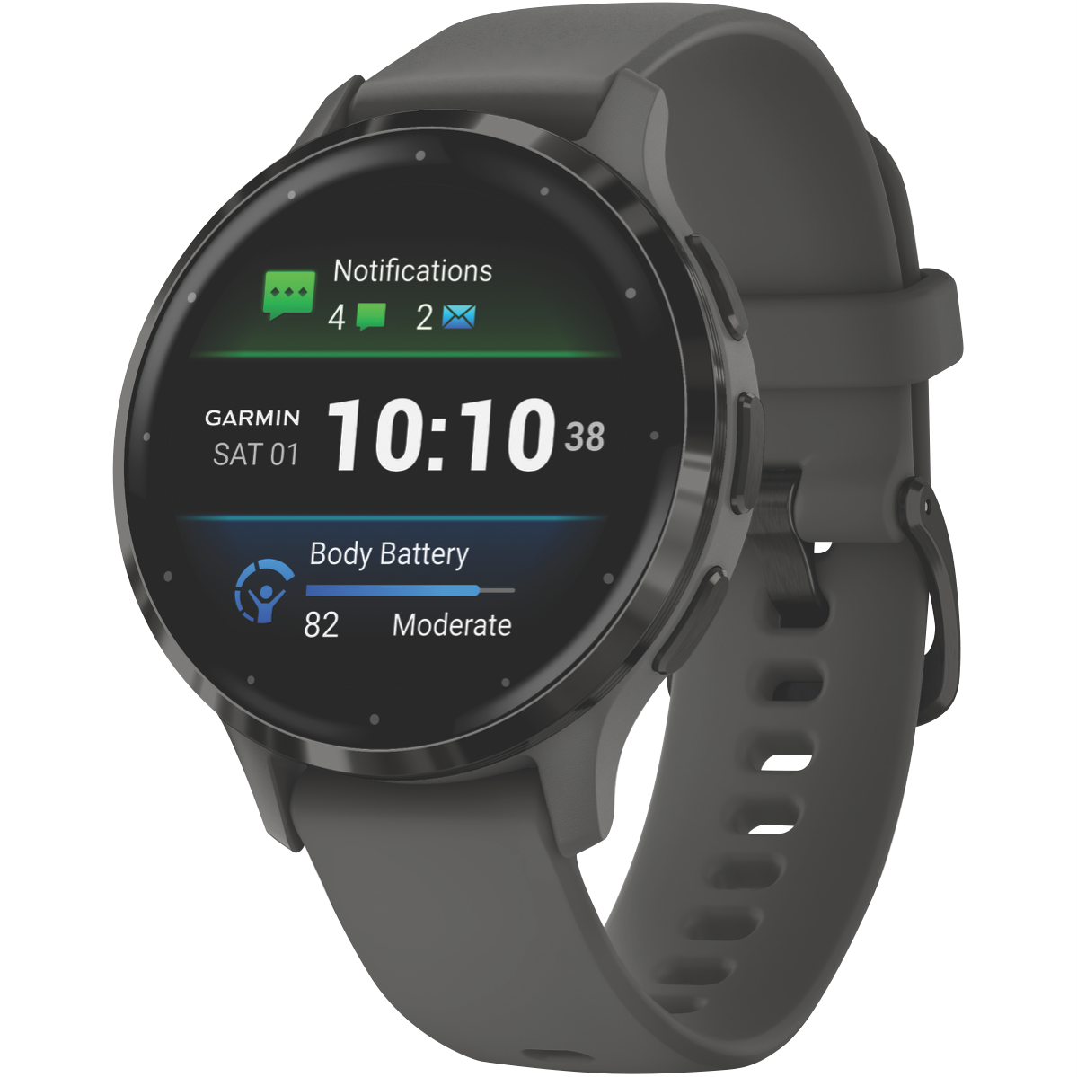Ready to elevate your daily wellness and fitness insights? The stylish Garmin Venu 3S smartwatch in pebble gray slate offers advanced health tracking and GPS right from your wrist. With a lightweight 41mm stainless steel bezel case and always-on AMOLED display this smartwatch provides easy access to your health stats notifications music and more. Monitor your heart rate sleep patterns stress and blood oxygen levels to gain a better understanding of your overall wellbeing. Built-in sports apps GPS and 24/7 health monitoring allow you to track running cycling swimming golf and more to help you reach your fitness goals. Receive smart notifications for calls texts social media and other apps right on your wrist when paired with your compatible smartphone. The long battery life 5ATM water rating and durable design also make this a reliable smartwatch you can wear all day during workouts and in the pool. With 8GB of storage for music and Garmin Pay contactless payments you have everything you need right on your wrist. Get deeper insights into your health and optimize your training with Garmin s most vibrant AMOLED display yet. The manufacturer's part number for this product is 010-02785-00. Take your health and fitness to the next level with the Garmin Venu 3S smartwatch.
