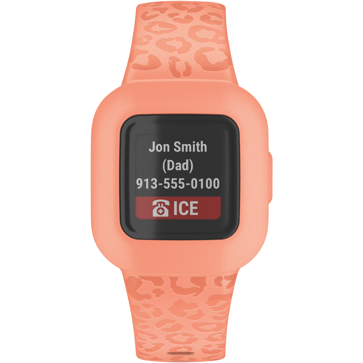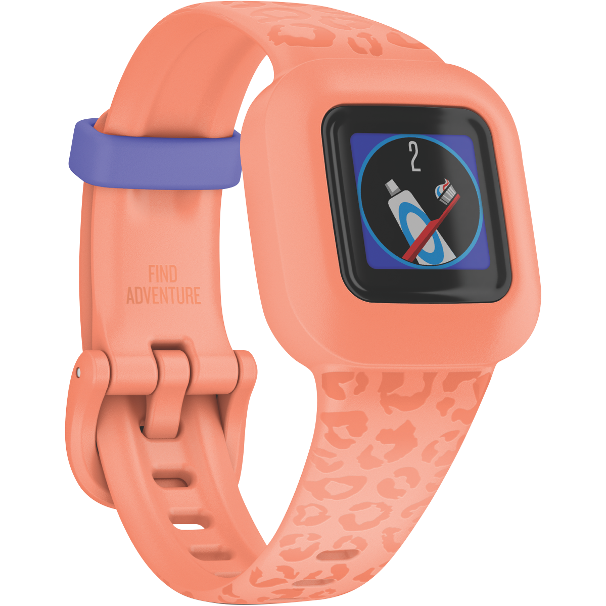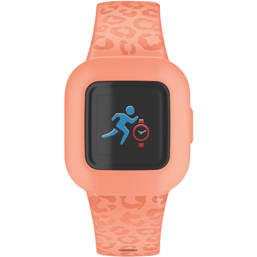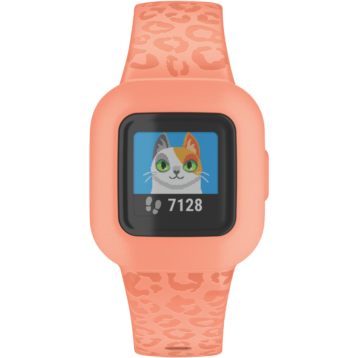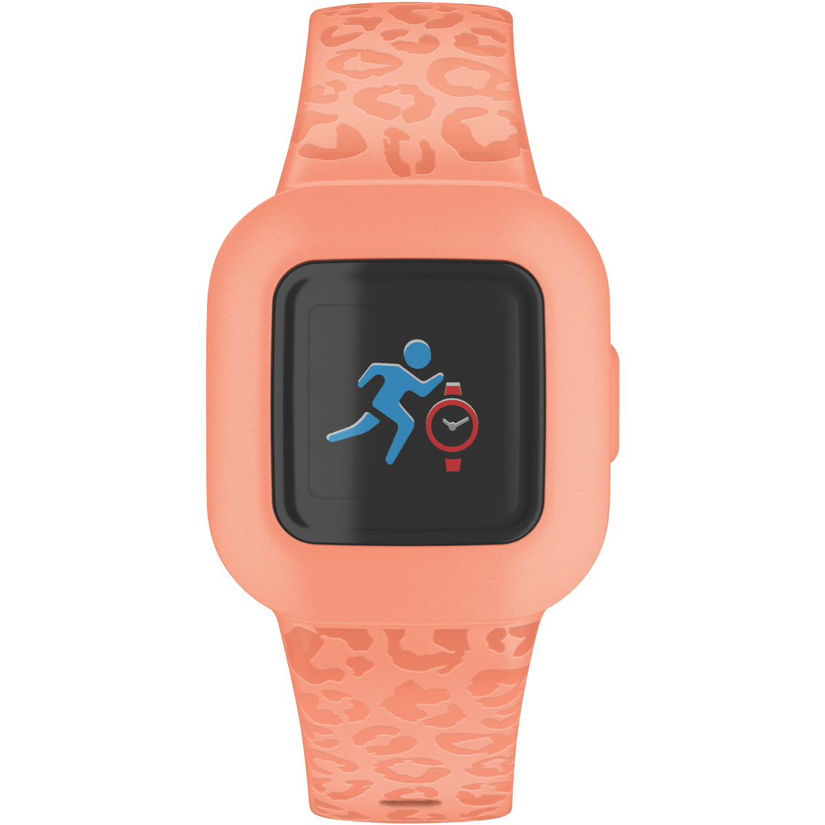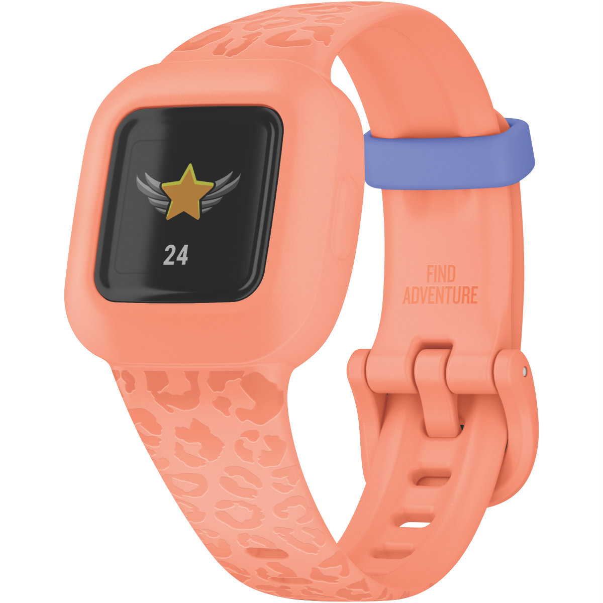 Introduce your child to the world of fitness tracking with the Garmin Vivofit Jr3 Peach Leopard. This stylish activity tracker has a sunlight-visible display and adjustable silicone band to fit kids ages 4 and up. It tracks steps sleep and 60 minutes of recommended daily activity to encourage healthy habits. With rewards and mobile app connectivity the Vivofit Jr3 makes fitness fun. Built-in GPS lets kids go on real adventures and earn coins for movement. The band is swim-friendly and has a 1+ year battery life so your child can wear it worry-free. Help your child gain healthy habits for life with the Garmin Vivofit Jr3. The manufacturer's part number for this product is 010-02441-24. Discover the difference a fitness tracker can make for your child today.