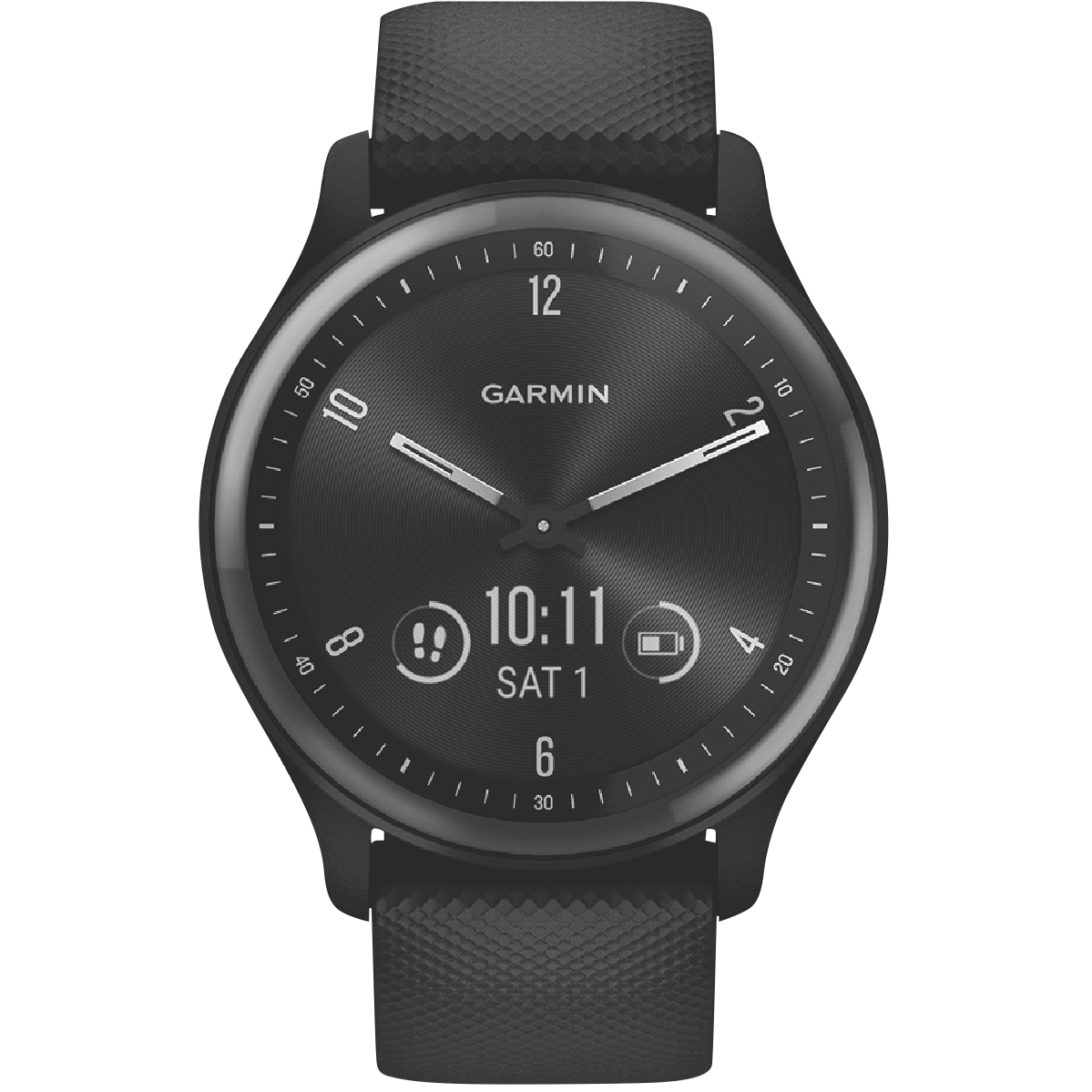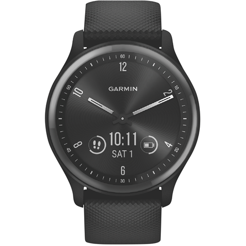 A sleek companion that helps you live healthier while keeping you connected the Garmin Vivomove Sport fitness tracker in black features a hidden OLED touchscreen display and stylish silicone band. Discreetly track steps calories heart rate and more with the touch of a button. When you want to see your stats just swipe to reveal the vivid display. This versatile fitness tracker also delivers smartphone notifications right to your wrist so you can stay on top of calls texts and social media updates without pulling out your phone. With up to 5 days of battery life in smartwatch mode or 2 weeks in basic watch mode it keeps going as long as you do. The silicone band is lightweight and comfortable for all-day wear. Take your health and fitness to the next level with the Garmin Vivomove Sport. The manufacturer's part number for this product is 010-02566-00.