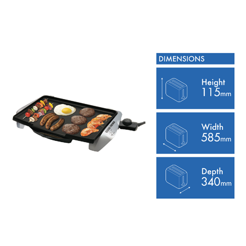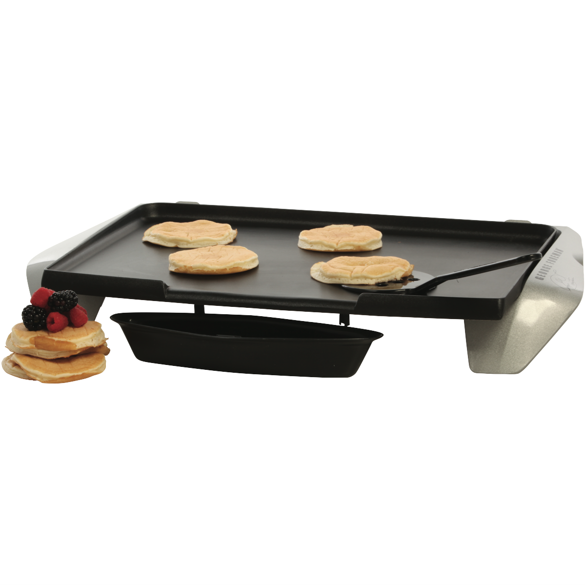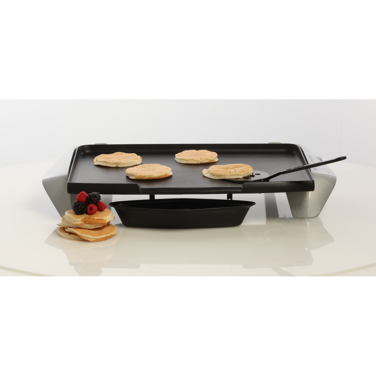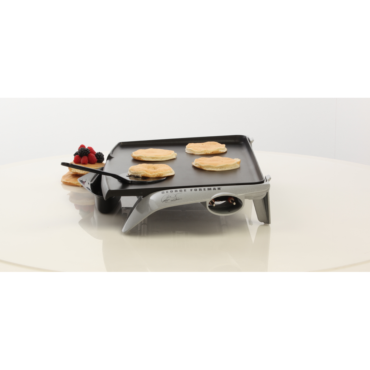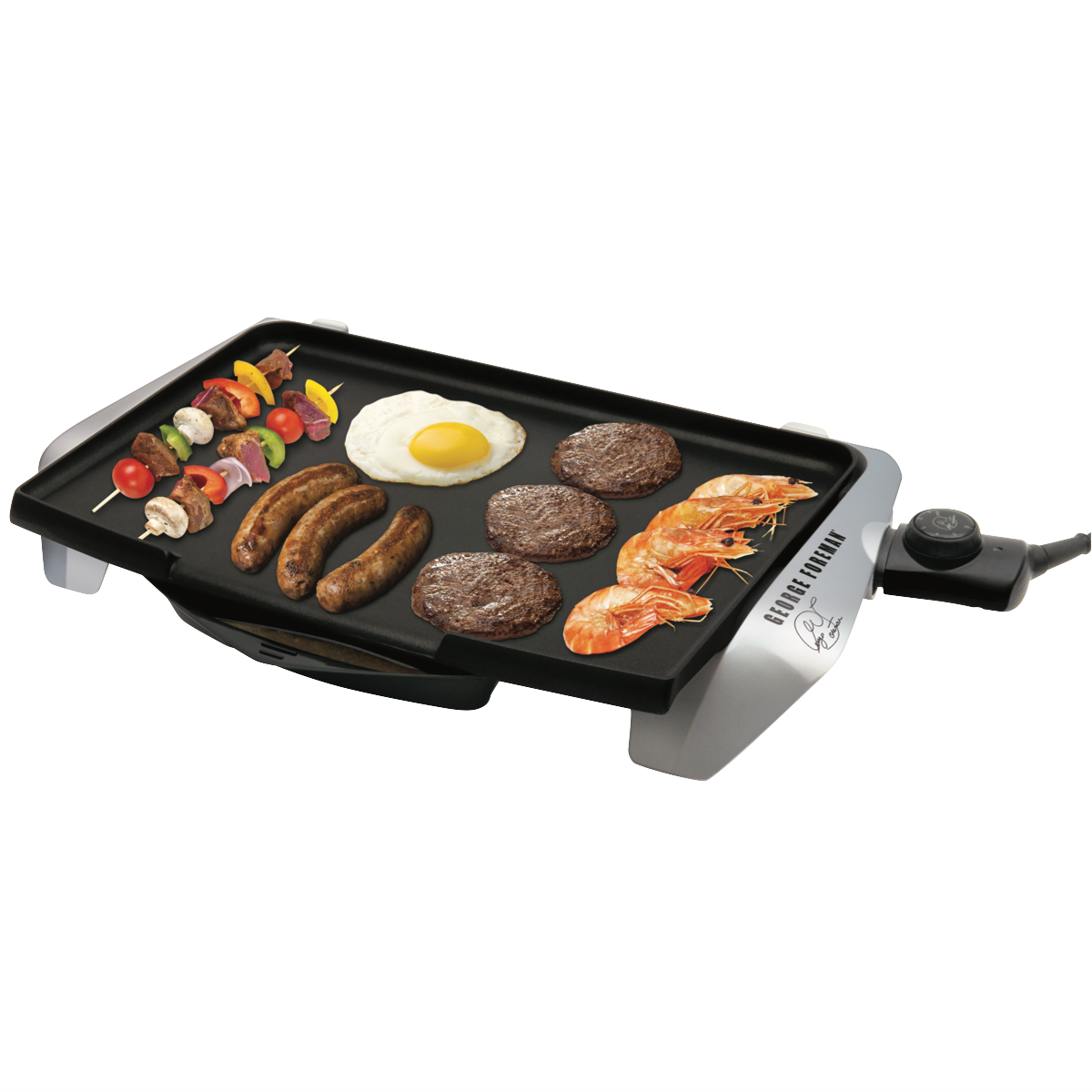 Sizzle up your morning routine with the George Foreman Electric Griddle. This versatile 2000-watt grill features a large non-stick cooking surface that easily handles everything from pancakes to steaks. With adjustable temperature control across five heat settings you can cook a wide variety of foods to perfection. The removable plates and drip tray make cleanup a breeze. This electric griddle includes a flat spatula along with recipes to get you started. With its sleek black design and compact footprint this George Foreman grill looks great on any countertop. Whether you're cooking for one or for a crowd this electric griddle streamlines meal prep. The George Foreman GREG10 Electric Griddle will be your new go-to for easy delicious breakfasts lunches and dinners. The manufacturer's part number for this product is GREG10. Bring home the versatility of this electric grill today.