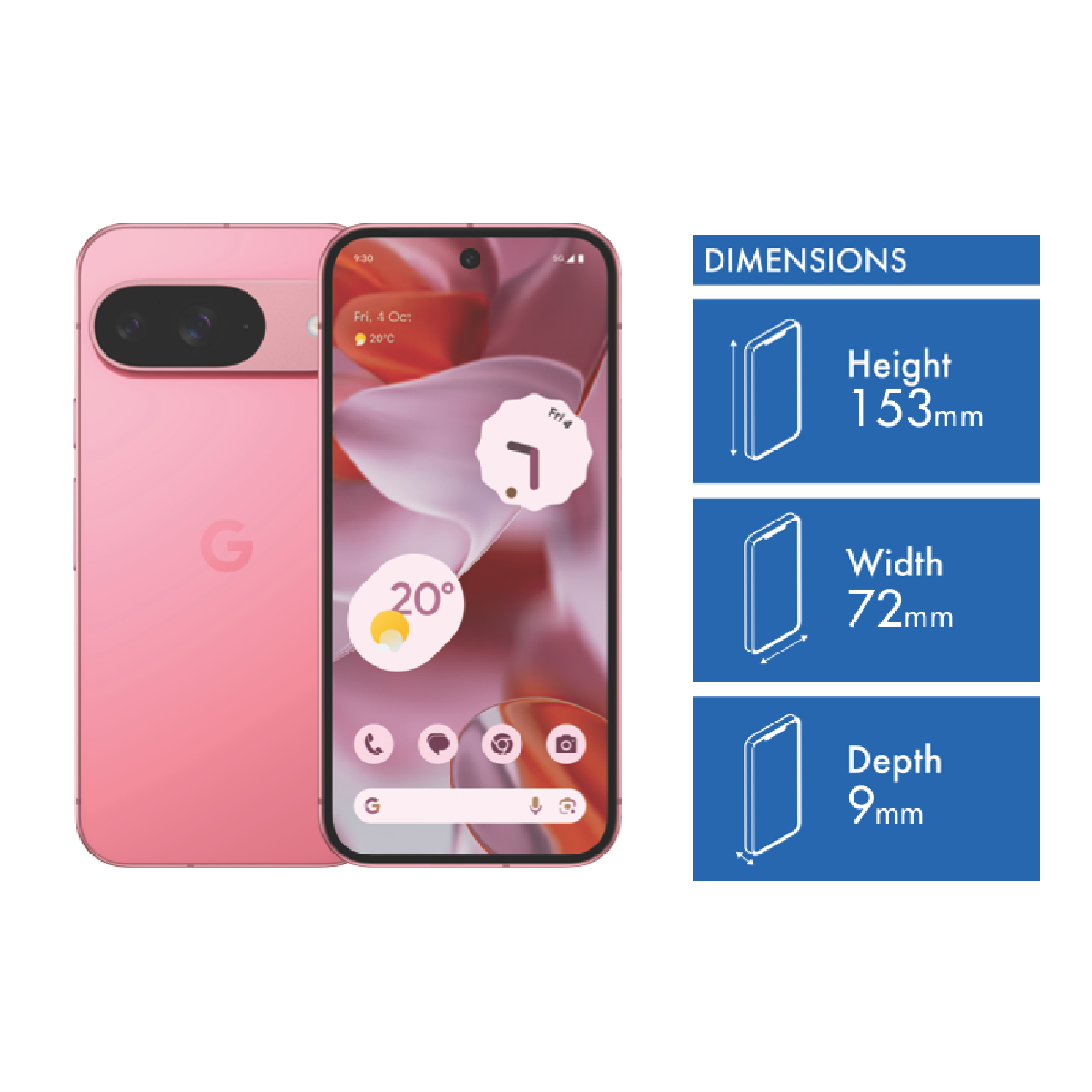 The Google Pixel 9 256GB Peony 11901324986 is the phone full of firsts. The Google Tensor G4 processor is Pixel's most powerful chip yet built for advanced AI like Gemini cutting-edge photos and videos and smarter ways to help all day. The Pixel 9 runs fast and smooth with 12 GB of RAM to handle Google's advanced AI across the 6.3-inch sharp and vibrant Actua display running at up to 120 Hz for smooth gaming scrolling and switching between apps. The Pixel 9 battery can last on avergae over 24 hours(1) and up to 100 hours with Extreme Battery Saver(1) along with charging from 1% to 55% in about 30 minutes(2). Pixel is designed to handle everyday spills and dust with an IP68 rating(3) and the display is scratch and damage resistant with Corning Gorilla Glass Victus 2.1.The advanced Pixel Camera includes a 50 MP main sensor for incredible image and video quality and a new 48 MP ultrawide camera for stunning Macro Focus. The advanced Pixel Camera with AI takes sharp vivid photos and videos in any light or from far away. Night Sight takes any photos portraits and panos in low light perfectly like concerts and cityscapes even the Milky Way with Astrophotography. Magic Editor in Google Photos makes complex edits easy even with a few taps AI can change the background move objects and more like reframing a photo. It can suggest the best crop and even expand the image to get more of the scene like adding autumn leaves or green grass. Easily remove distractions like photobombers or unwanted objects and use Audio Magic Eraser to help reduce distracting noise in video like music and wind then turn up the sounds that you want. Get an amazing group photo by combining similar photos or choose everyone's best expression. Photo Unblur can help sharpen fuzzy pics new or old and Add Me helps make sure that no one is left out of a photo - take one with the group then swap in the photographer - Pixel can magically merge both photos. Powered by the ultrawide lens Macro Focus creates magnificent shots from the smallest details raindrops snowflakes petals or a blade of grass.Gemini helps supercharge your ideas just hold the power button to start writing planning learning and more(4). Kickstart productivity and creativity by writing notes making plans and more. Use Gemini to summarise unread messages in Gmail content in Google Drive and more content. Gemini can help find info from Google apps like pulling party details from an invite in Gmail and suggesting nearby florists in Maps. Chat with Gemini to get more info quickly by engaging it over an app or screen to learn more or take action. Snap a photo and use Gemini to get answers like how to save a dying plant what recipes will work from a fridge's contents and more. Circle what you want more info about whether it's an image text or video - Pixel helps find it fast right from the app you're in. Keep can help you plan pack and shop by creating intelligent lists for whatever you need. Pixel Screenshots helps you save info you want to remember later like events places and more. So you can find what you need right when you need it.If you're in an emergency press the power button five times and Pixel will call emergency services and share your location with contacts(5). Pixel can alert nearby hazards like flooding fire or an earthquake and can send updates to help ensure you your family and friends stay safe. Pixel can also detect if you've been in a severe car crash(6) then call the emergency services share your location and notify emergency contacts. Call Screen can detect and filter out spam calls. It answers unknown numbers and finds out who's calling and why so you can decide whether to pick up(7). Pixel protects against spam and scams in messages with Google Safe Browsing protecting you from phishing attacks malware and deceptive sites. Get a boost of helpfulness with automatic Pixel Drops that include new camera features helpful tools and more so Pixel keeps getting better over time. Your new Pixel comes with seven years of OS and security updates and new and upgraded features with Pixel Drops from launch(8). Pixel 9 contains recycled metals glass and plastic with the Pixel frame made from 100% recycled aluminium plus the packaging is 100% plastic-free.Disclaimers: (1) Average battery life based on testing using a median Pixel user battery usage profile across a mix of talk data standby and use of other features. Quote up to 100 hours battery life based on testing using a median Pixel user battery usage profile across a mix of talk data standby and use of limited other default features in Extreme Battery Saver mode which disables various features including 5G connectivity. Battery life depends upon many factors and usage of certain features will decrease battery life. Actual battery life may be lower. (2) Based upon testing with device batteries drained to 1% and charged with Google 45W USB-C Charger (sold separately). Charging testing conducted by Google in early 2024 on pre-production hardware and software using default settings with the device powered on. Charging speed depends upon many factors including usage during charging battery age and ambient temperature. (3) Designed to comply with IP68 rating under IEC standard 60529 when each device leaves the factory. Device is not fully waterproof or dustproof. Accessories are not water or dust resistant. Water resistance and dust resistance are not permanent conditions and will diminish or be lost over time due to normal wear and tear device repair disassembly or damage. (4) Gemini mobile app and features are available for selected devices languages and countries. Internet connection required. Check responses for accuracy. (5) Personal Safety app features are dependent upon network connectivity and other factors and may not be reliable for emergency communications or available in all areas. For more information see g.co/pixel/personalsafety. (6) Car Crash Detection is not available in all languages or countrie