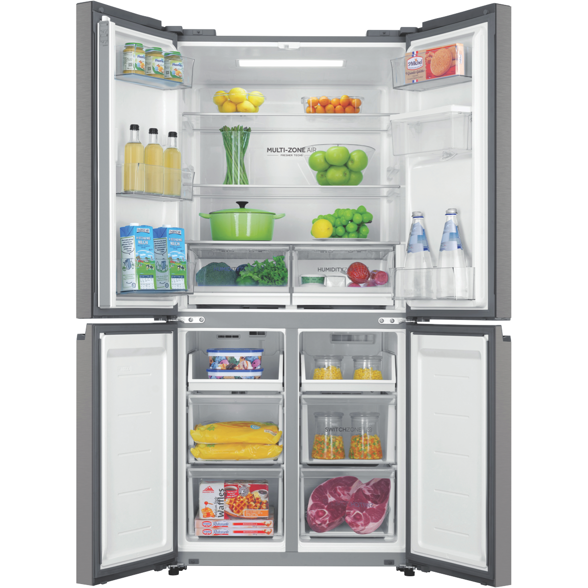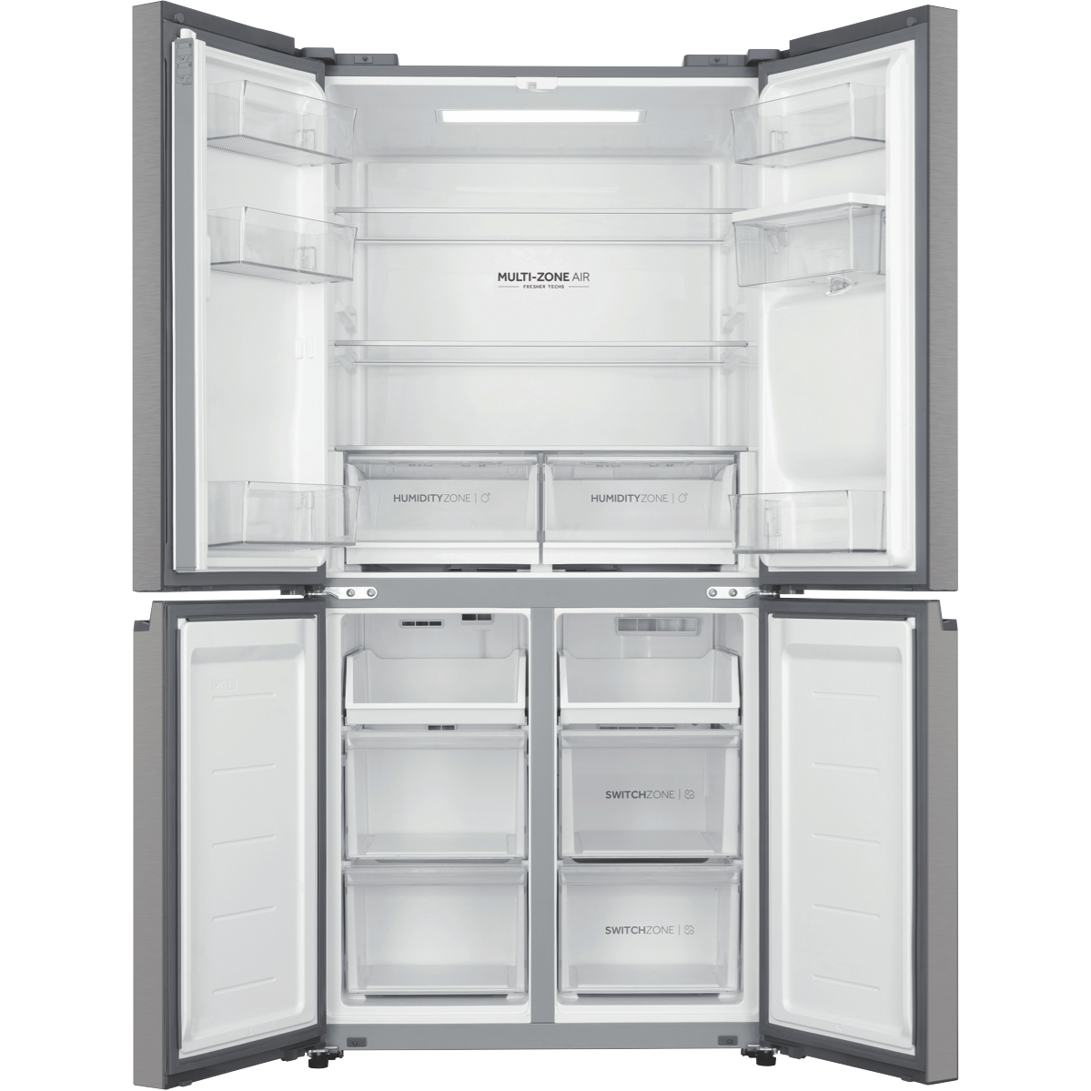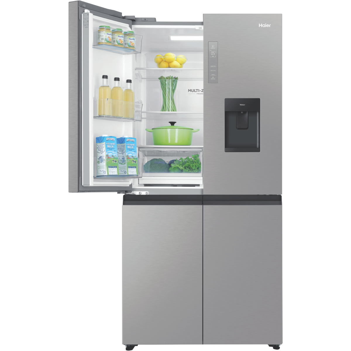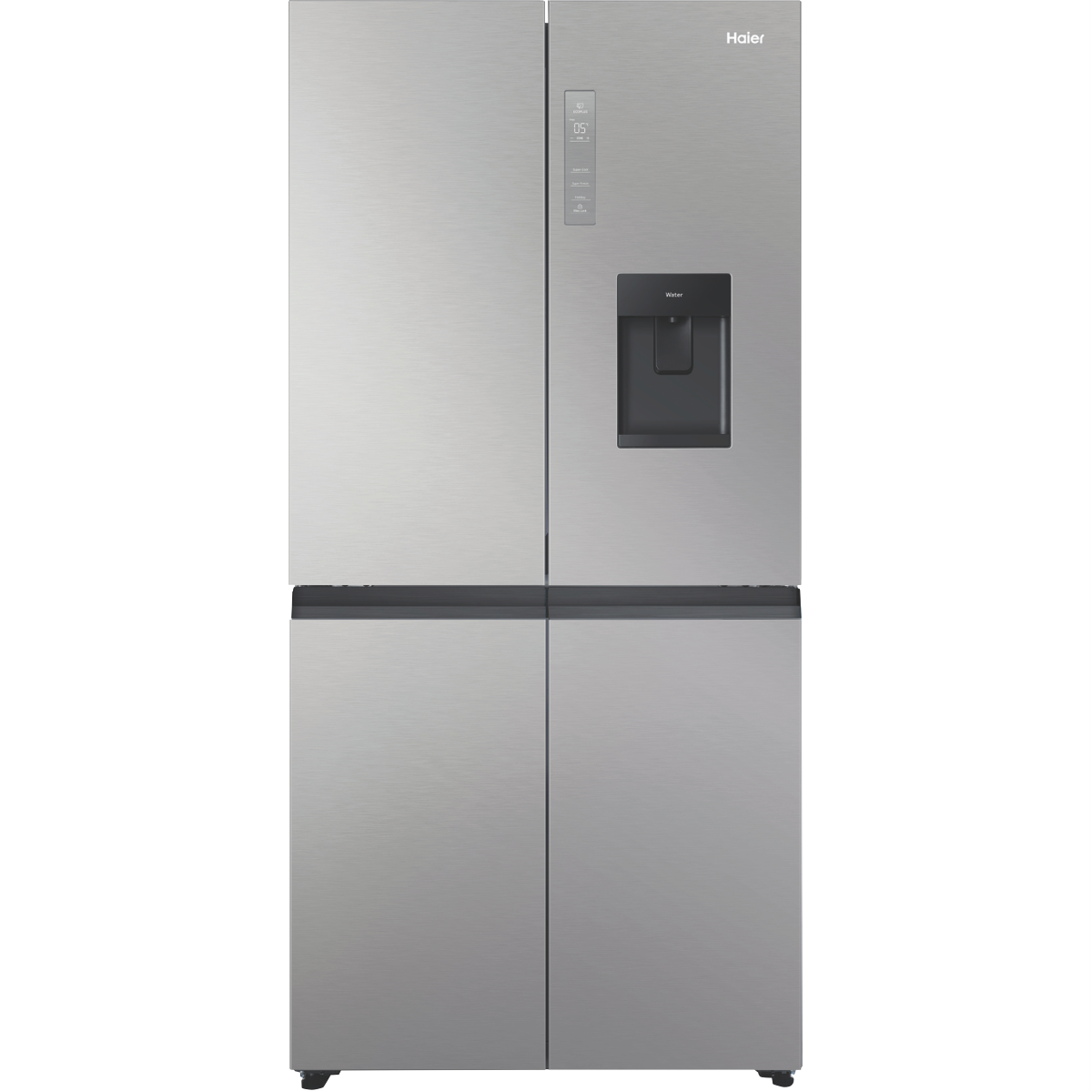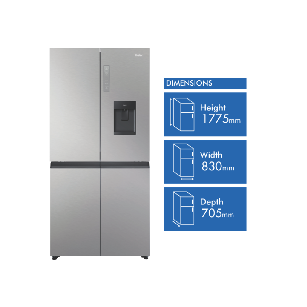 Bring everyday convenience to your kitchen with the spacious Haier 508L Quad Door Refrigerator. This large-capacity fridge offers ample storage for the weekly shop and boasts smart features to keep food fresher for longer. The water dispenser provides cool filtered water without plumbing required. Flexible storage options like the SwitchZone compartment and Humidity Fresh Zone create a customisable fridge interior to suit your needs. Multi-zone air cooling maintains an even temperature throughout so food stays fresher in any part of the fridge or freezer. Antibacterial protection ensures a hygienic interior. Set the holiday mode when you're away to save power and use the smart lock to keep little fingers out of your treats. With sleek silver styling this fridge adds a touch of modern style to your home. The Haier fridge measures 830mm W x 1775mm H x 705mm D. Backed by a 2 year manufacturer's warranty for peace of mind.