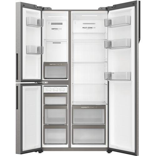 Take control of your food storage with the sleek and spacious Haier 575L side by side refrigerator. With a generous total capacity of 574 litres this fridge provides ample storage for the weekly shop. The 385 litre fridge capacity keeps perishables crisp and fresh while the 86 litre freezer has room for frozen foods ice cubes and more. Rated an energy efficient 4 stars this fridge helps reduce your energy bills without compromising on features or style. Dual door hinges allow for left or right opening to suit your kitchen layout. The satin silver finish adds a touch of sophistication to any home. Inside the multi-zone air cooling system maintains an optimal temperature no matter how often you open the doors. The humidity control system prevents food spoilage and the Super Freeze function rapidly freezes new items added to the freezer. Enjoy the convenience of in-door water and ice thanks to the internal dispenser. Flexible storage options like the Switch Zone allow you to adapt the fridge to your needs. With smart lock doors and front levelling feet for stability on uneven floors this refrigerator offers premium quality you can depend on. Covered by a 2 year manufacturer's warranty this side by side fridge provides the storage space and features you need. The HRF575XS delivers excellent value for money. See all the details online today.