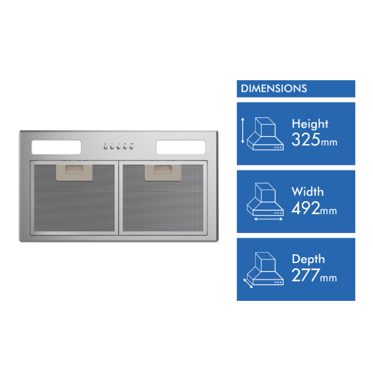Bring modern style and convenience to your kitchen with the Haier 60cm Integrated Insert Rangehood. This sleek stainless steel rangehood features a powerful 780m3/hr airflow to effectively remove steam smoke and odours while you cook. With 3 fan speeds you can adjust the ventilation to suit whatever's cooking on the stovetop. The integrated design and slim 325mm height allow the rangehood to seamlessly blend into your kitchen cabinetry for a streamlined look. LED lighting illuminates the cooktop for optimal visibility when cooking and cleaning. The push button controls offer straightforward operation while the aluminium filters are simple to remove and clean. Ducted or recirculated installation provides flexible options to suit your home. This rangehood includes 2 mesh filters to get you started.Measuring 60cm wide the Haier rangehood is well-suited to 600mm cooktops. With a 2 year manufacturer's warranty you can cook with confidence knowing this stainless steel rangehood will keep your kitchen breezy fo