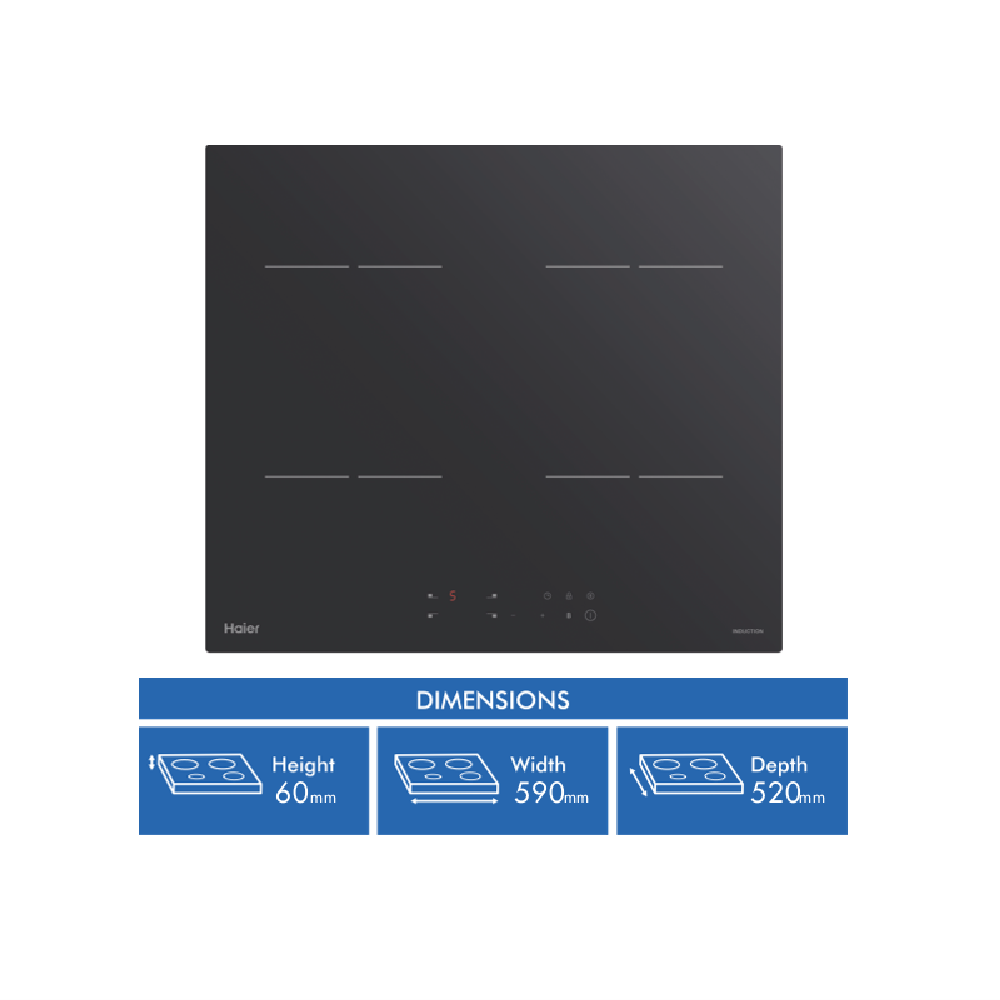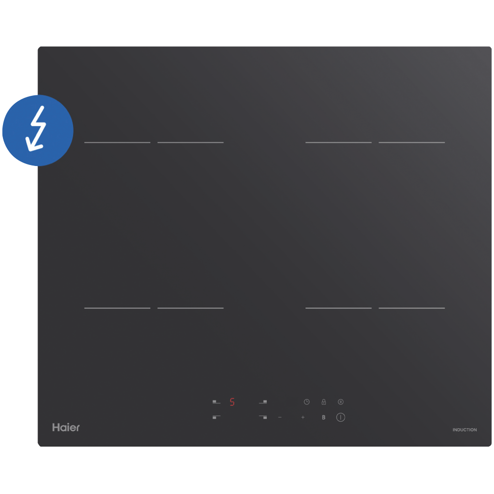 Discover a new level of precision and control with the Haier 60cm Induction Cooktop. This sleek black ceramic glass cooktop will bring a contemporary style to your kitchen. With four cooking zones and 9 power levels including a boost function you can fine-tune every meal. The touch controls allow you to easily adjust settings set timers and lock buttons to keep little fingers safe. The induction technology is not only stylish but offers fast energy-efficient cooking by directly heating pans instead of wasting heat. Alerts for overheating and overfilling keep your cooktop in optimal condition. With a 2 year warranty this Haier induction cooktop is built to last. At 60cm wide it is sized to fit standard spaces. Bring restaurant-quality cooking home with this feature-packed induction cooktop from Haier. The manufacturer's part number for this product is HCI604TPB3. Enjoy the benefits of induction cooking with the potential to use the existing wiring in your kitchen. Specific electrical situations may vary. Please consult with a licensed electrician.