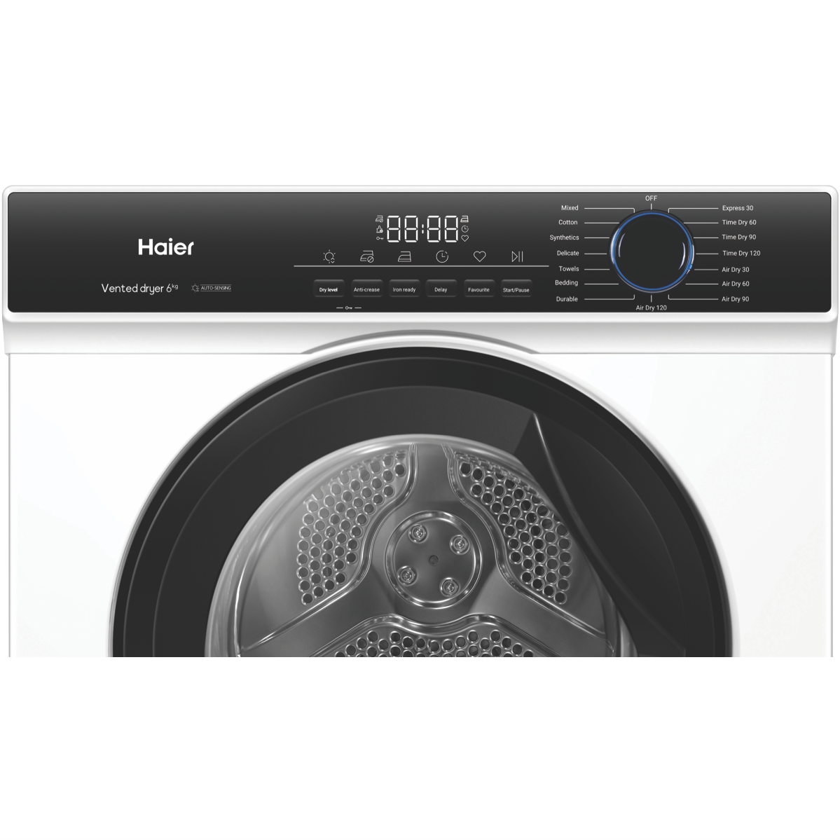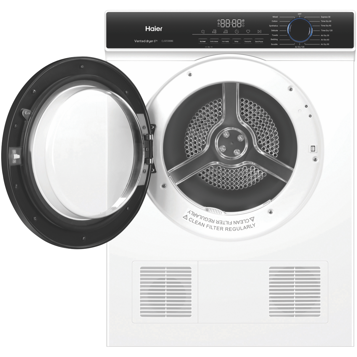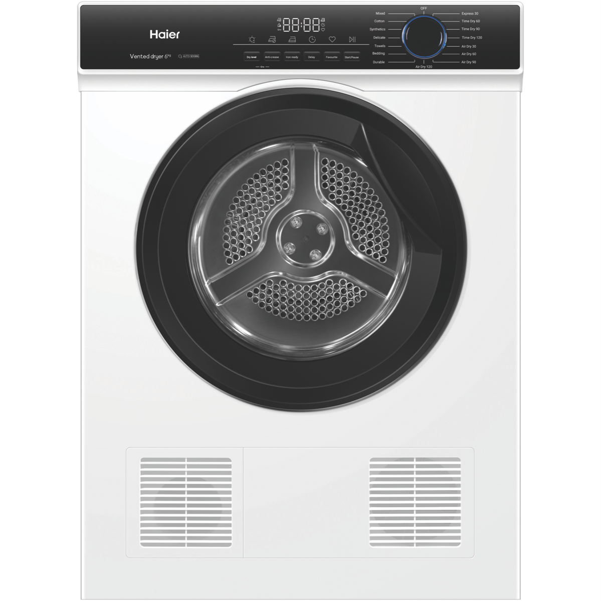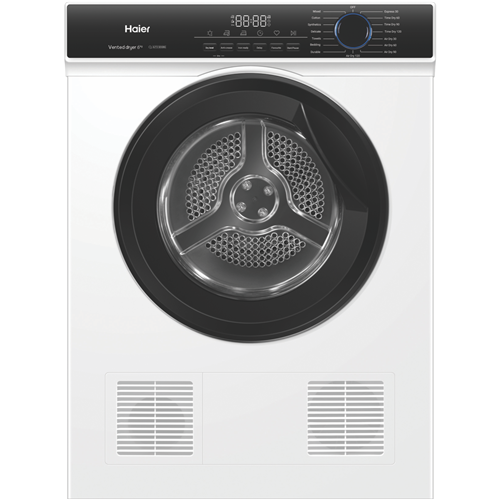 Dry clothes efficiently and conveniently with the Haier 6kg Vented Dryer. This wall-mountable white clothes dryer features a generous 6kg drying capacity and 15 programs including Air Dry Bedding Cottons Delicate Durable Express 30 Mixed Synthetics Time Dry and Towels so you can select the perfect cycle for each load. With auto-sensing technology anti-crease function and adjustable dryness levels this dryer takes the guesswork out of drying for optimized results. Mounting and stacking kits allow flexible installation. The easy access lint filter and keylock add convenience. With front and rear venting options this Haier clothes dryer can fit into any space. Backed by a 2 year manufacturer's warranty for peace of mind. The HDV60AWW1 is the manufacturer's part number for this dryer.