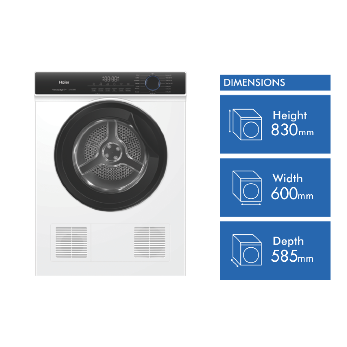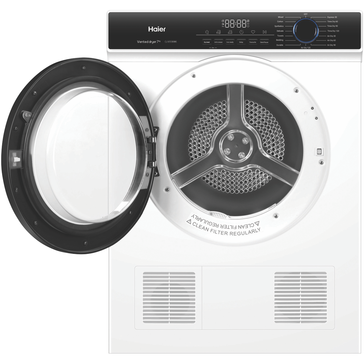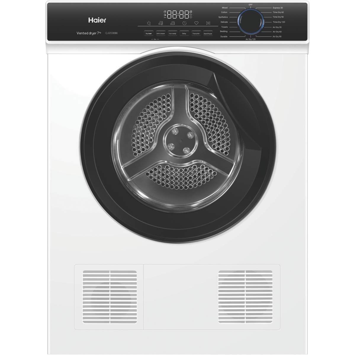 Dry faster with the Haier 7kg Vented Clothes Dryer. This white dryer comes with auto-sensing technology to optimize drying times for each load. With 15 specialized programs like Air Dry Delicate and Towels you can customize cycles to suit every fabric type. The sensor drying adjusts run times based on moisture levels preventing over-drying. With features like delay start anti-crease and a keylock this dryer offers convenience and excellent performance. Mount it on the wall to save floor space. The lint filter is easy to access for quick cleaning between loads. At 600mm wide this compact dryer is sized for apartments or small laundry rooms. With multiple venting options you can install it to suit your home. The manufacturer's part number for this product is HDV70AWW1. Get this 2-star energy rated clothes dryer from Haier to simplify laundry days.