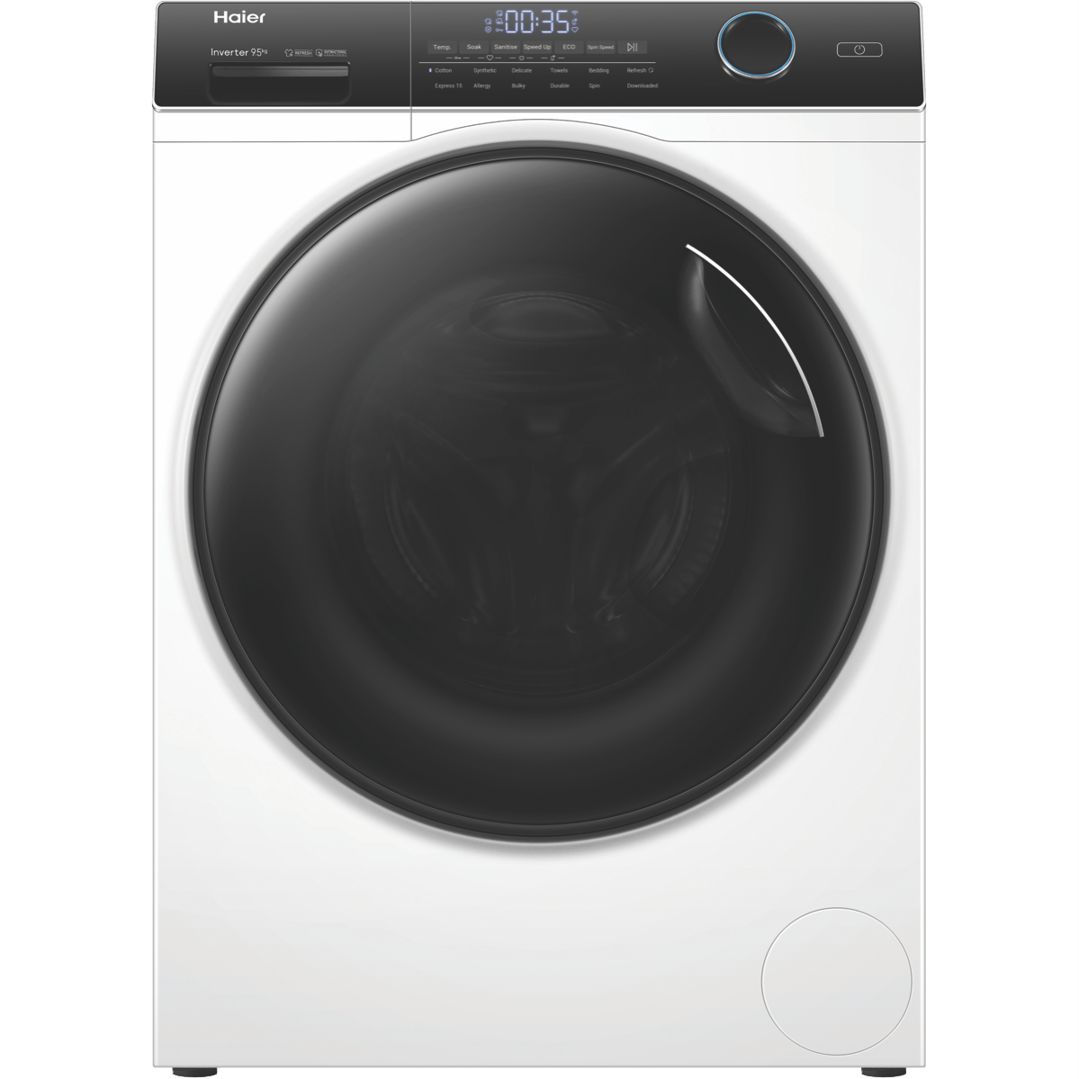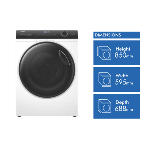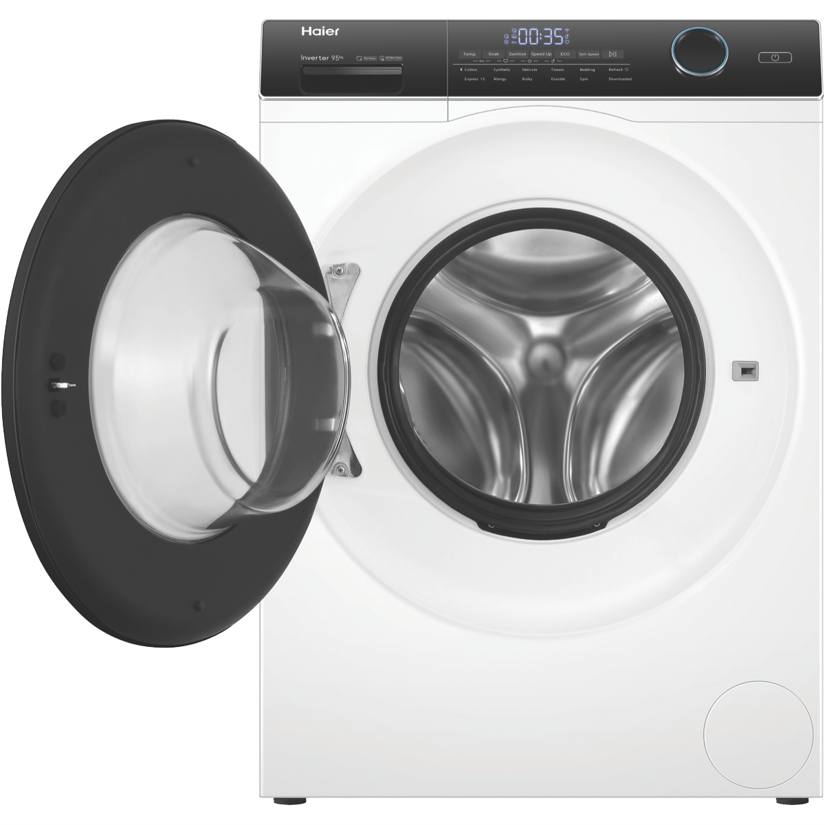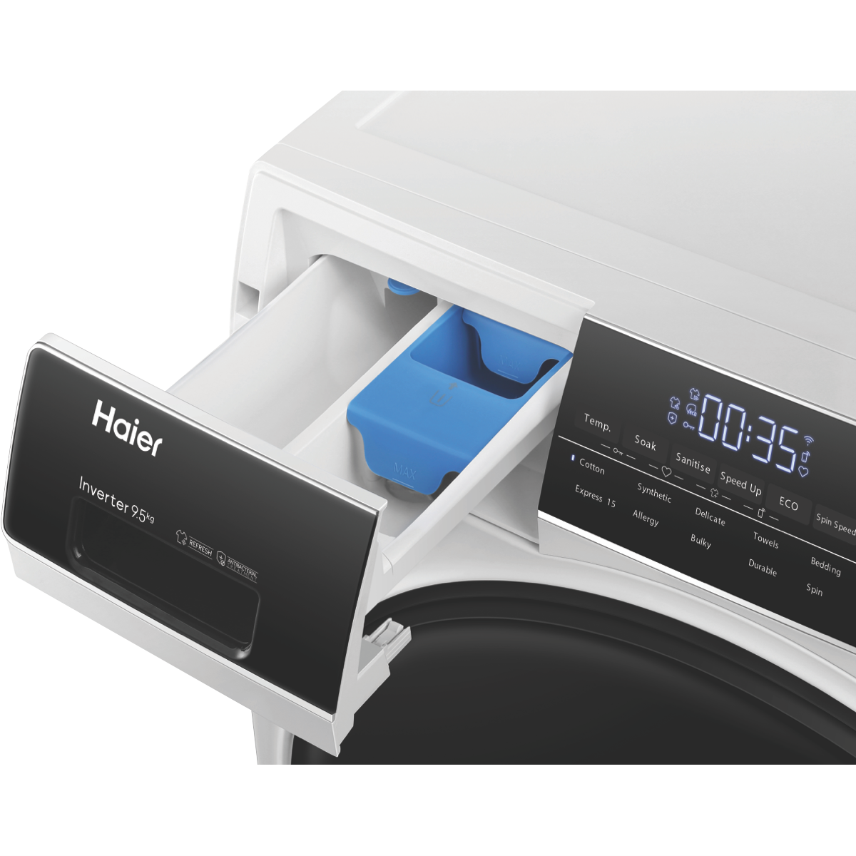 Tackle laundry piles in no time with the powerful Haier 9.5kg Front Load Washer. This sleek white washing machine delivers an impressive 1400rpm max spin speed to quickly dry loads. The large 9.5kg capacity allows you to wash more in a single load saving you time. Stay in control with the 12 flexible programs like Refresh Express 15 and Speed Up. The Anti-Bacteria Treatment in the gasket and detergent dispenser prevent nasty odors. Connect via WiFi to remotely monitor cycles. The energy efficient 4 star rating and impressive 4.5 star WELS water rating save resources. With a spacious 595mm width 850mm height and 688mm depth it fits most laundry spaces. The manufacturer's part number for this product is HWF95AN1. Invest in this durable front loader knowing it's backed by a 2 year warranty for peace of mind.