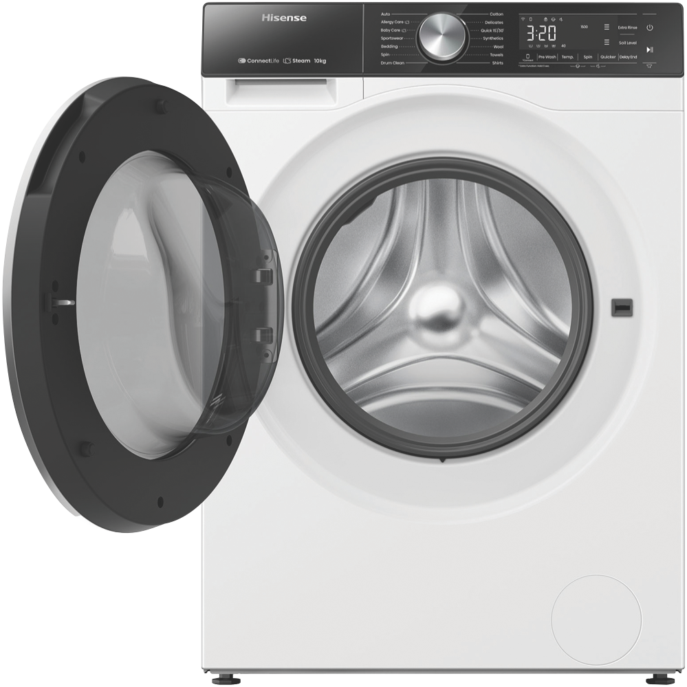 Enjoy effortless and efficient laundry days with the Hisense 10kg Front Load Washer. This white front loader boasts a generous 10kg capacity perfect for handling multiple loads of washing for medium to large households. The powerful 1500rpm spin speed helps remove excess water from your clothes reducing drying time. With a 4.5 star WELS water rating and 5 star energy rating you can save water and energy. The Hisense Washer features 14 versatile wash programs to care for everything from regular cottons to woollens activewear baby clothes and more. The Auto Wash function intelligently senses the optimal wash cycle while Steam keeps clothes fresh and reduces allergens. Delay End lets you schedule wash cycles up to 24 hours in advance for added convenience. Additional features like Pure Jet wash system and Hygiene Guard provide a thorough clean while the Smart Wizard takes the guesswork out of settings. With a matching Hisense dryer available it s easy to create a complete laundry solution. Backed by a 3 year manufacturer s warranty for peace of mind. The manufacturer's part number for this product is HWFS1015E.Bring home the Hisense 10kg Front Load Washer for an effortless laundry experience.