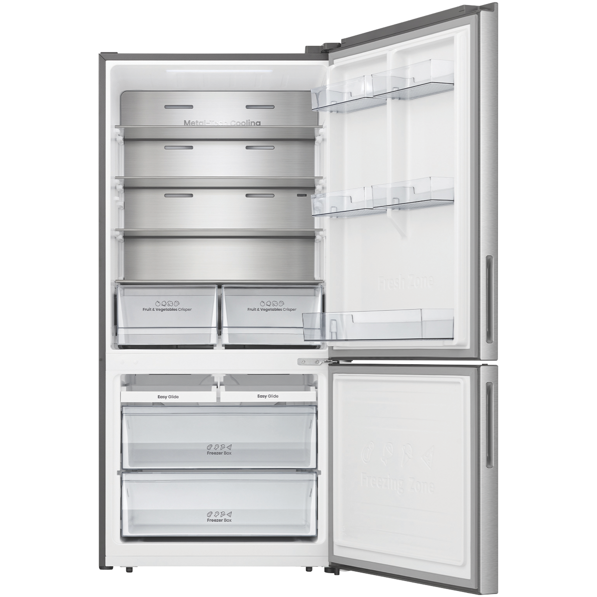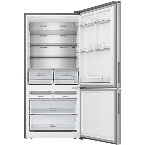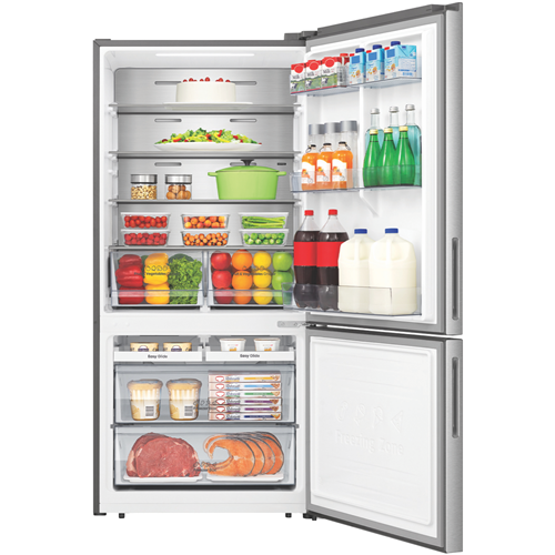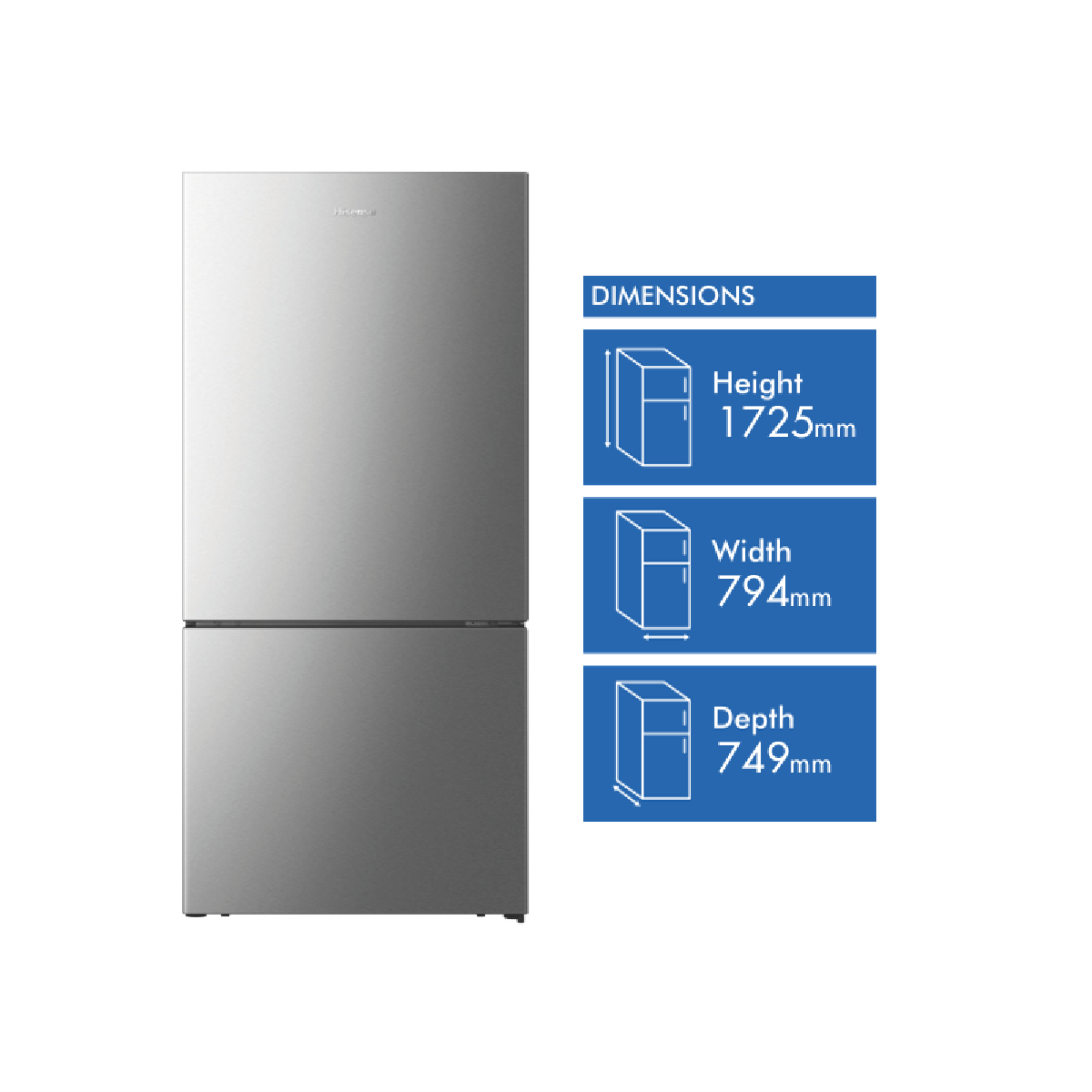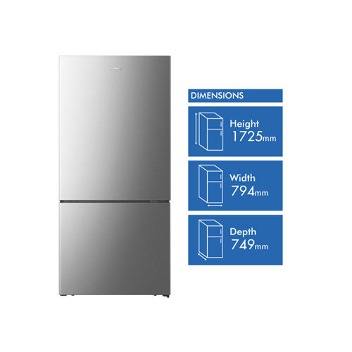 Introduce elegant style and spacious storage into your kitchen with the Hisense 503L Bottom Mount Refrigerator. This bottom freezer fridge combines sleek stainless steel styling with ample 503 litre total capacity to keep your family's favorite foods fresh and organized. The generous 354 litre fridge area features adjustable glass shelving double vegetable crispers and a big bottle rack to accommodate everything from leafy greens to party platters. The 149 litre freezer on bottom includes handy metal glide drawers for neatly storing frozen foods ice cream tubs and more. This refrigerator is equipped with a range of advanced features for ultimate convenience including Total No Frost to prevent icy buildup soft LED lighting to illuminate the interior and electronic touch controls for quick adjustments. The counter depth design allows the refrigerator to seamlessly blend into your existing layout. Backed by a 3 year manufacturer's warranty for peace of mind. The manufacturer's part number for this product is HRBM503S. With its family-sized storage sleek style and handy features like metal glide drawers this Hisense bottom mount refrigerator makes it easier than ever to store and access the fresh frozen and chilled foods your household loves.