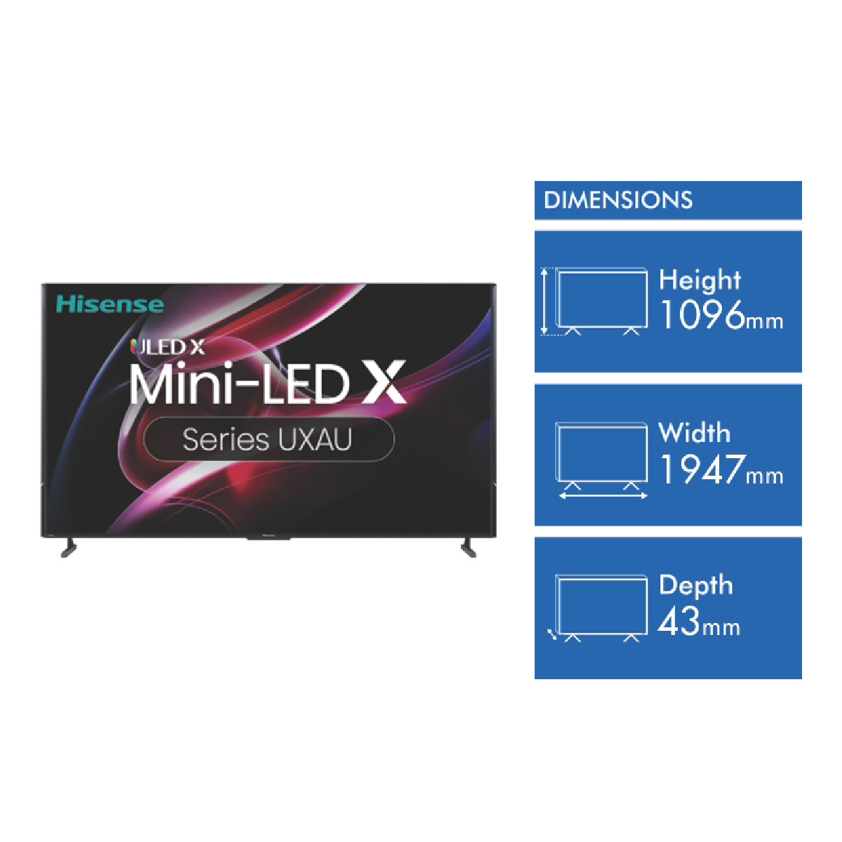 Step into an immersive viewing experience with the new 2023 Hisense 85 UXAU 4K ULED X Mini-LED QLED Smart TV. With its massive 85-inch 4K Ultra HD screen powered by Quantum Dot and ULED x Mini LED technologies this television delivers jaw-dropping colors inky blacks and dazzling brightness for a cinematic picture. The smart TV platform features built-in voice control with Google Assistant and Amazon Alexa giving you hands-free control. Gaming is enhanced by the fast 200Hz motion rate and Auto Low Latency Mode for smooth lag-free visuals. CineStage X audio pumps out room-filling 4.1.2 surround sound. With four HDMI inputs for your devices this future-ready UHD TV is packed with features to upgrade your home entertainment. Measuring 1156mm x 1947mm x 447mm and weighing 56.2kg the 2023 85 UXAU model (part number 85UXAU) from Hisense is the ultimate ticket to an immersive viewing experience right at home. Learn more about this television's capabilities today.