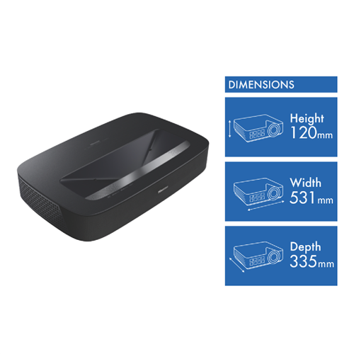 Bring the cinema home with the Hisense PL1H 4K Laser Cinema Ultra Short Throw Smart Projector. This sleek home theatre projector boasts 4K Smart Laser Cinema projection technology for jaw-dropping 3840 x 2160 resolution on screen sizes ranging from 80 to 120 inches. Powered by VIDAA U6 Smart OS you can stream all your favourite entertainment from Netflix Stan and more in stunning Dolby Vision quality. With built-in Dolby Atmos this projector delivers immersive cinematic surround sound. Connect your devices via the two HDMI inputs or access media directly from USB. Measuring 120mm high 531mm wide and 335mm deep the compact 11kg PL1H fits into any home theatre setup. Released in 2023 Hisense backs this projector with a 3 year warranty. Bring the big screen experience home and enjoy larger-than-life 4K entertainment with the PL1H Laser Cinema Projector from Hisense. The manufacturer's part number for this product is PL1H. Check out the PL1H today for an immersive home theatre.
