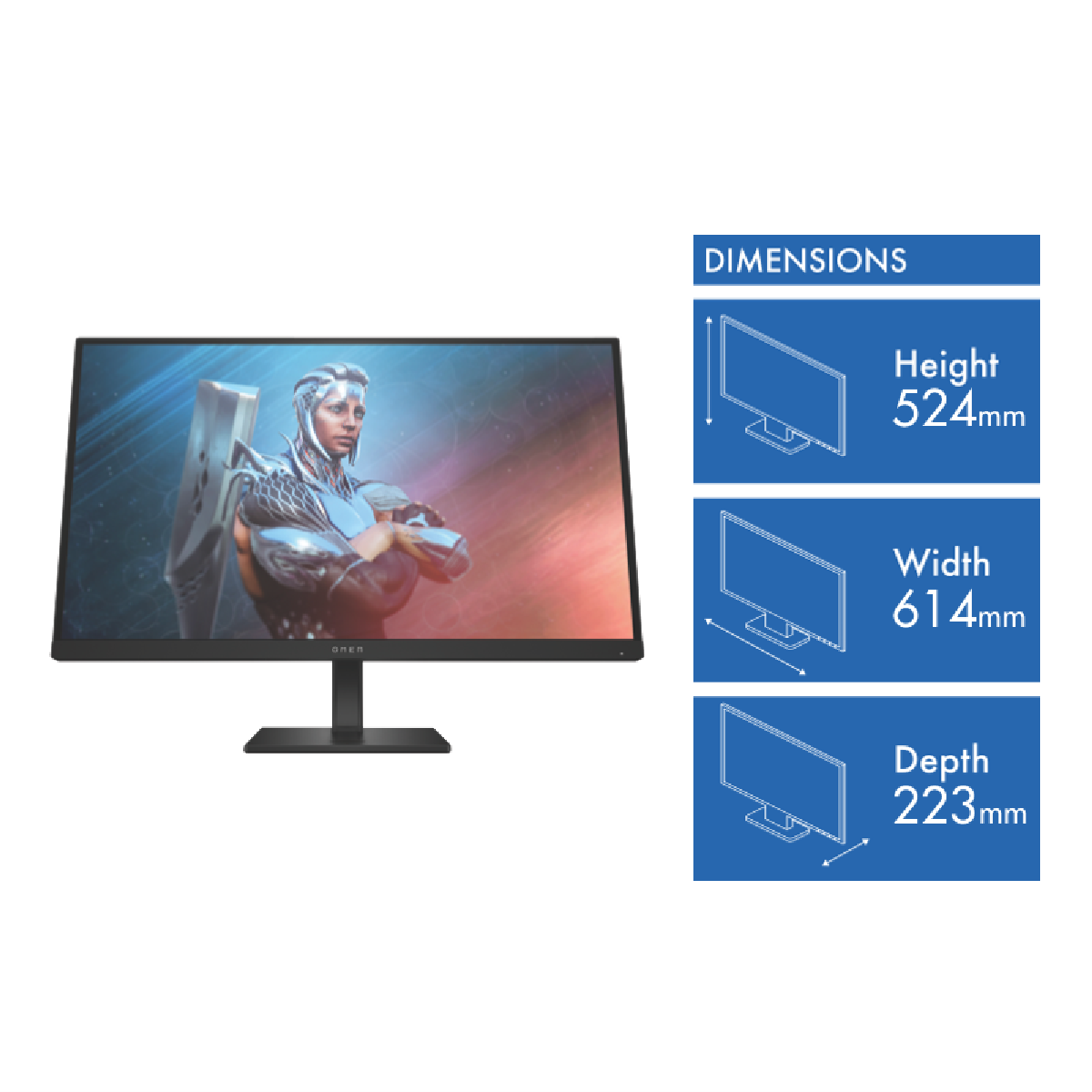 Immerse yourself in vivid crystal-clear visuals and ultra-smooth gameplay with the HP 27 OMEN FHD Gaming Monitor. This 27-inch display delivers full HD 1920 x 1080 resolution 400 nits brightness and 1000:1 contrast ratio for remarkably crisp detailed images. An extremely fast 1ms response time and 165Hz refresh rate equip you with lightning reflexes to dominate first-person shooters MOBAs and racing titles. The 16:9 widescreen aspect ratio provides an expansive field of view for immersive gaming while AMD FreeSync Premium technology and G-Sync compatibility eliminate stuttering and tearing. Connect to gaming consoles via the HDMI and DisplayPort inputs. Adjust the height and tilt for ergonomic comfort during marathon sessions. This gaming display comes equipped with HP's renowned build quality and a 3 year warranty for long-lasting performance. 780G0AA is the manufacturer's part number of this product. Experience high-fidelity visuals that bring your games to life with the HP 27 OMEN FHD Gaming Monitor.