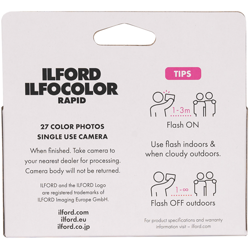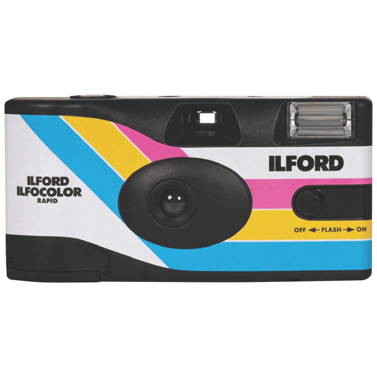 The ILFORD ILFOCOLOR RETRO Single use camera is pre-loaded with 27-exposure ISO 400 colour negative film. The fast film combined with a built-in flash makes the ILFOCOLOR camera a versatile performer delivering great results outdoors and indoors in low light as well.The camera features an optical viewfinder essential when shooting in bright sunlight. It s equipped with a fixed-focus wide angle (31mm) f11 lens. Shutter speed is 1/125 sec and delivers sharp images down to 1m.It s pre-loaded with an AAA battery with a 15-second recycle time for low light shooting and fill flash in bright daylight.