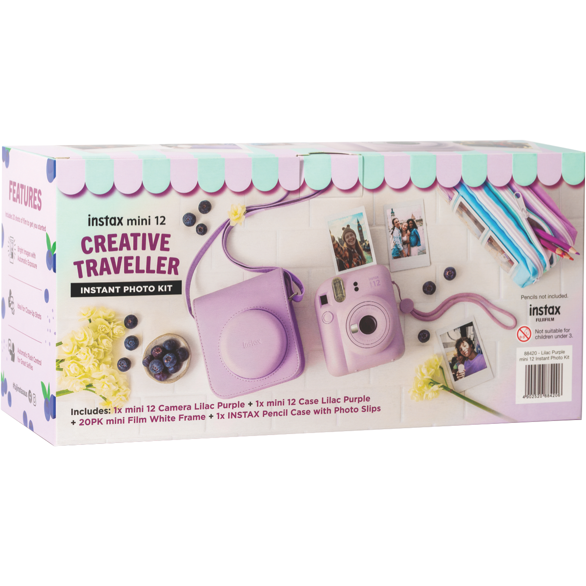 Capture life's special moments in a snap with the Instax Mini 12 Premium Bundle in a stylish purple hue. This instant camera is designed for portability and ease of use letting you take photos on the go and print them out instantly to share with friends and family. The compact body measures just 150mm high 120mm wide and 305mm deep making it easy to slip into your bag or carry with you wherever you go. Despite its small size it still packs plenty of features to help you get the perfect shot every time. Plus it comes with a 1 year manufacturer's warranty for extra peace of mind. Part number: 88420.
