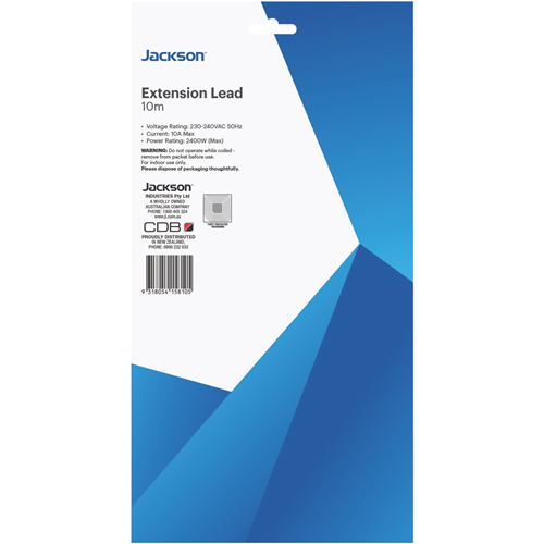 With its 10 metre reach the Jackson 10m Extension Power Lead provides the flexibility and convenience to power appliances far from an outlet. This robust lead features a modern white finish and durable plug and socket built to last. Use it to connect devices like vacuum cleaners power tools heaters fans and more in every room without having to unplug and replug each time. The generous 10 metre cord allows you to manoeuvre around furniture and reach even distant corners of any space. Constructed with safety in mind the tough lead has overload protection to prevent damage to your valuables. Housed in a sleek white casing the lead blends seamlessly into any home decor. Experience the freedom to recharge and power up with ease using the Jackson 10m Extension Power Lead. The manufacturer's part number for this product is PEXT10M. Check it out today for all your power extension needs.