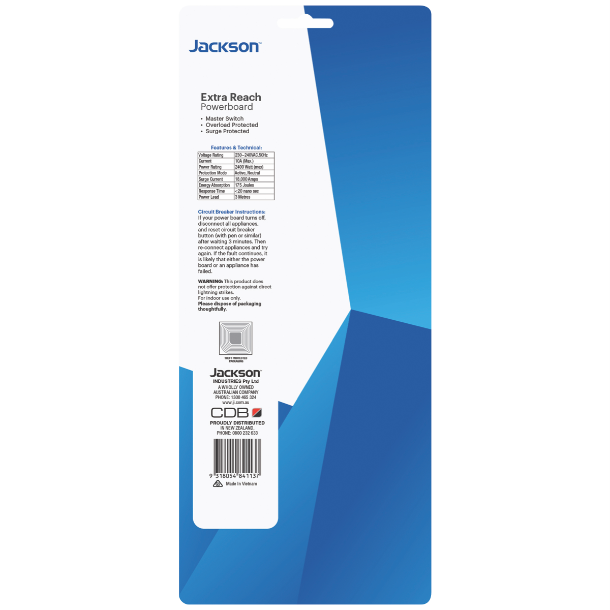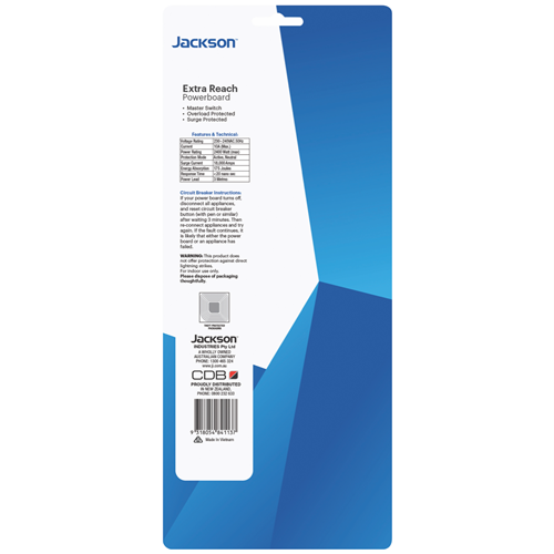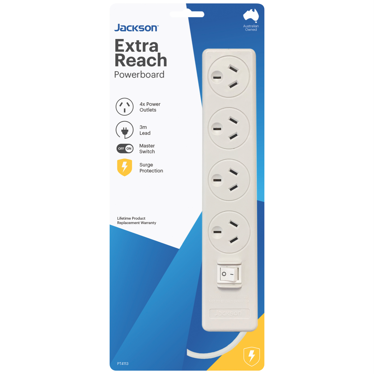 Step up your power board game with the Jackson 4 Way Surge Powerboard. This 3 metre lead powerboard with right angle plug provides convenient access to power wherever you need it. With 4 outlets integrated surge protection and a lifetime warranty from Jackson you can power your devices with confidence. The right angle plug allows you to tuck this powerboard neatly against a wall or behind furniture while the easy pull tab makes unplugging a breeze. Whether you need to connect a computer workstation or power a home entertainment setup this powerboard has you covered. Durable and designed for daily use the Jackson powerboard keeps your gear safe from surges and spikes. The manufacturer's part number for this product is PT4113. Bring reliable protected power to your home with this 4 outlet surge protector from Jackson.