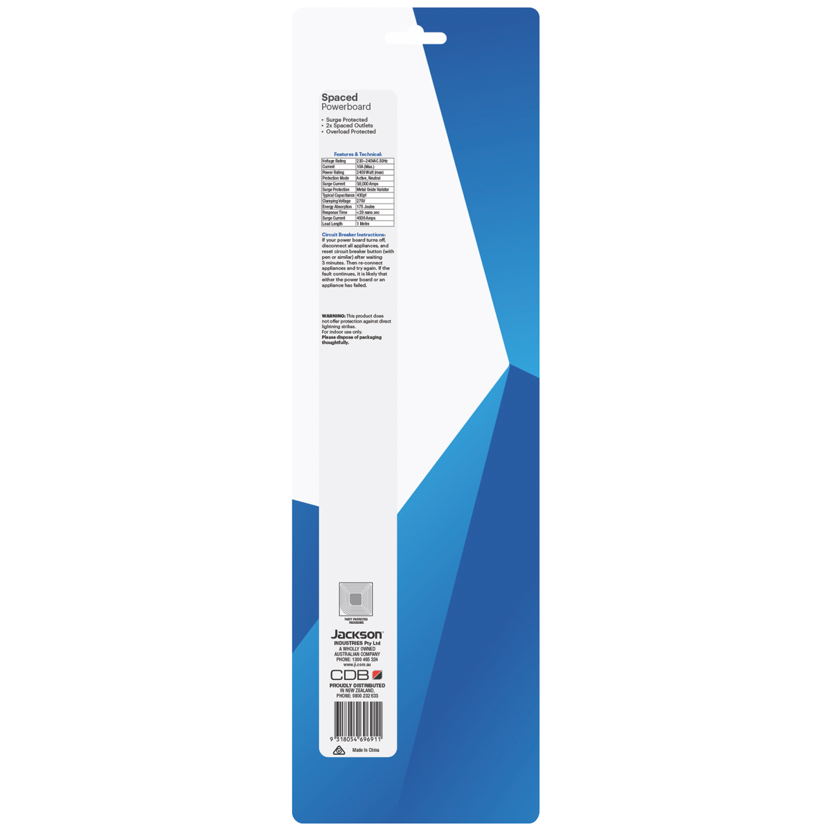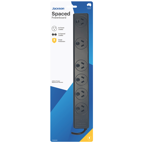 Keep your devices safe and powered up with the Jackson 6 Way Surge Protection Powerboard. This powerboard features 6 outlets and surge protection to prevent power spikes making it the ideal solution for your home office or entertainment setup. The safety overload protection provides peace of mind while the 1 metre lead with right angle plug allows flexibility in placement. With its modern matte black finish and lifetime warranty from the manufacturer this powerboard combines sleek aesthetics with lasting performance. Give your electronics an extra layer of defense against surges and outages. Bring home reliable power protection with the Jackson 6 Way Surge Protection Powerboard today. The manufacturer's part number for this product is PT6969SBE.