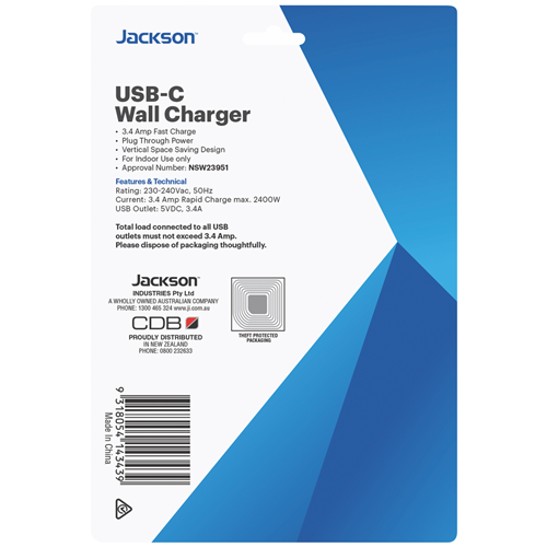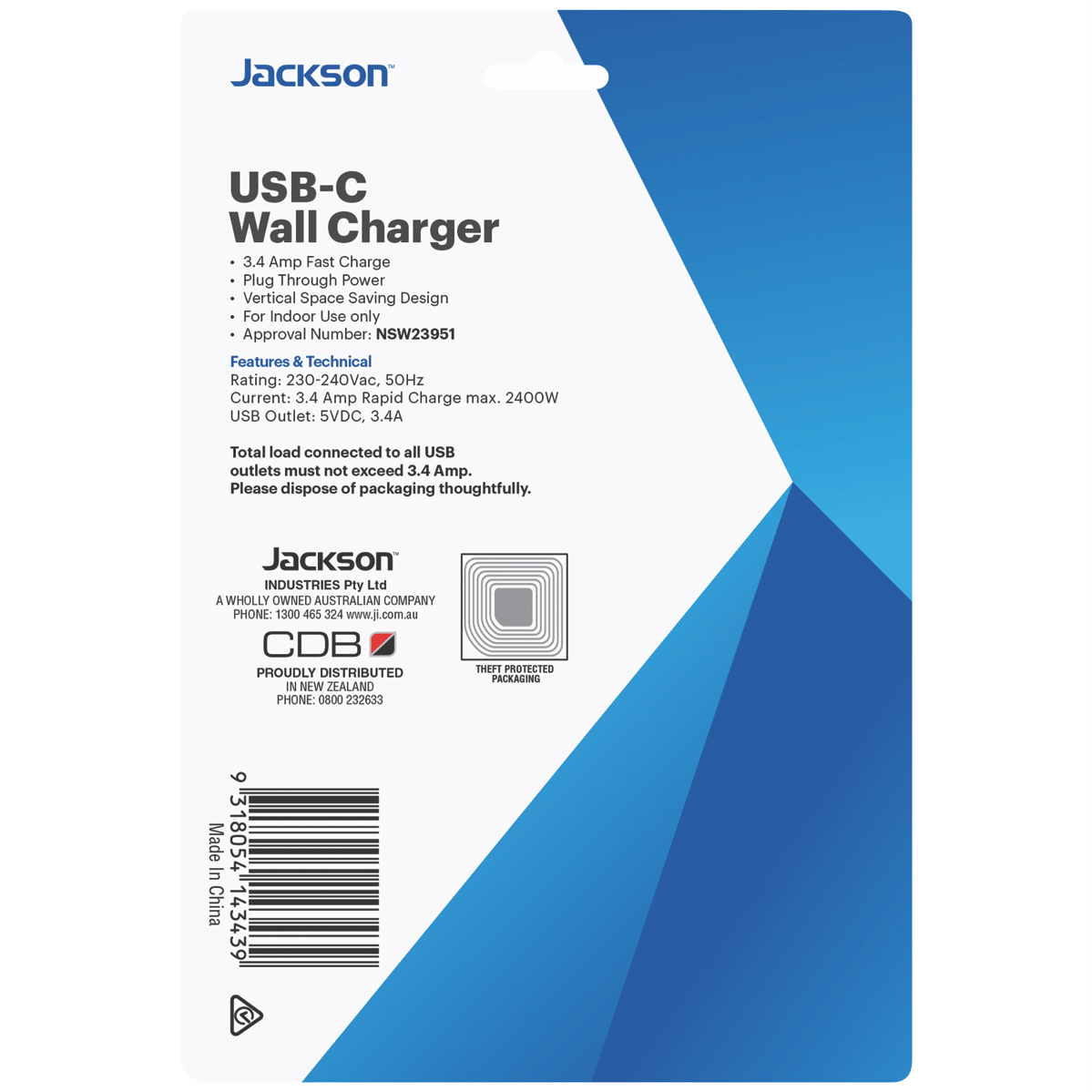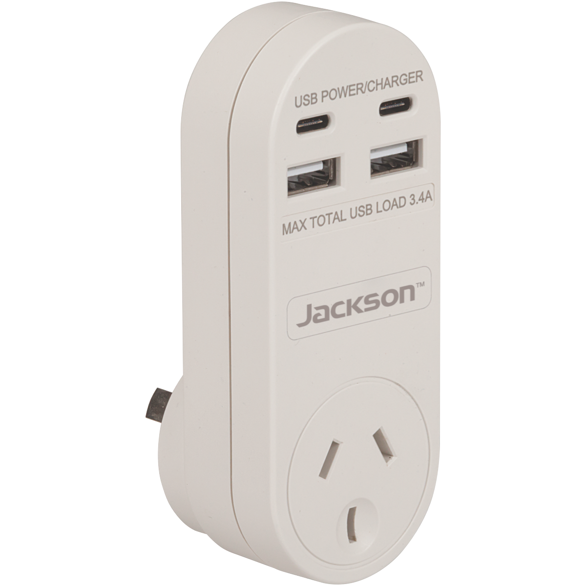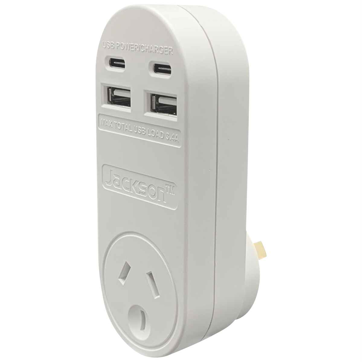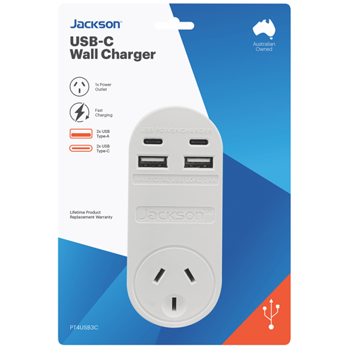 Power up your devices with the Jackson Dual USB-A & USB-C AC Charger. This versatile charger features one outlet and two USB ports along with two USB-C ports to charge everything from phones and tablets to laptops. The dual USB-A ports provide 2.4A shared while the USB-C ports pump out 18W each for rapid charging. With a compact design and foldable plug it's ideal for home office and travel. Charge multiple devices simultaneously without having to hunt for spare outlets. The foldable plug tucks away neatly making it easy to pack in your bag. Compatible with a wide range of devices this charger eliminates the need for multiple chargers. It delivers the optimized charging speed for each connected device. Crafted from durable ABS plastic it's built to last through years of regular use. The manufacturer's part number for this product is PT4USB3C. Give your gadgets the power boost they need with this versatile USB charger from Jackson.