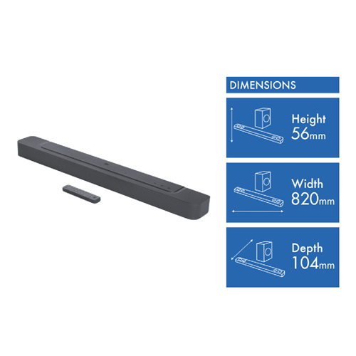 Immerse yourself in cinematic surround sound with the JBL Bar300 5.0 260W Virtual Atmos Soundbar. This sleek black soundbar pumps out room-filling 260W of total output through its 5.0 channel configuration enveloping you in audio bliss. With Bluetooth and WiFi connectivity you can stream all your favorite playlists and podcasts wirelessly. The inclusion of HDMI ports allows for seamless integration with your TV setup while the compact 56mm height ensures it fits perfectly below your display. Weighing just 2.5kg the soundbar can be wall mounted with the included hardware for a clean clutter-free aesthetic. For deeper bass and more powerful audio performance pair the soundbar with an optional wireless subwoofer. With a 2 year manufacturer's warranty you can enjoy this virtual Atmos soundbar knowing you're covered. The JBL Bar300 brings the cinema into your living room. The manufacturer's part number for this product is 5468768. Experience it for yourself today.