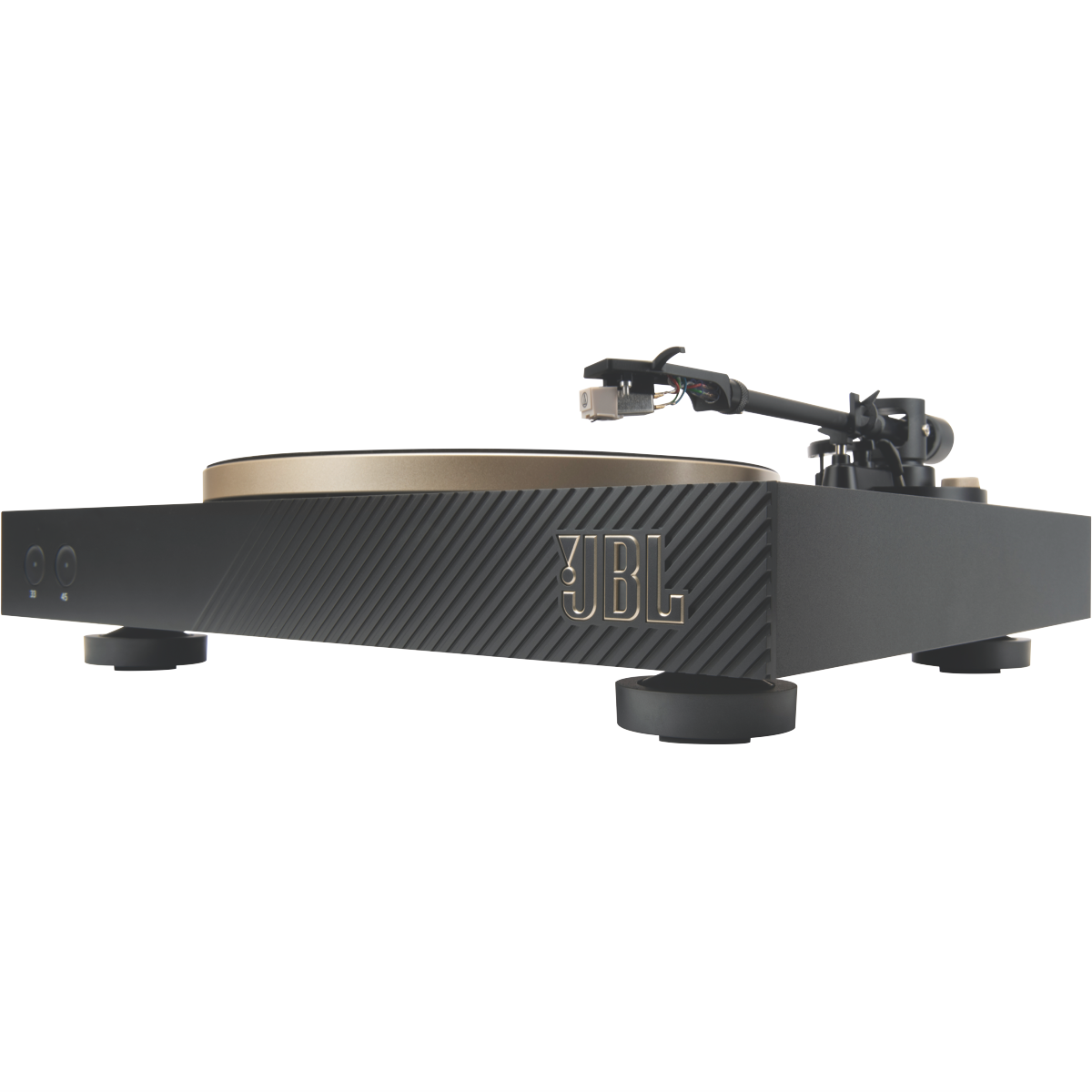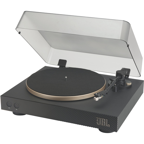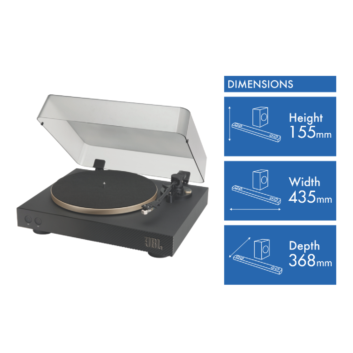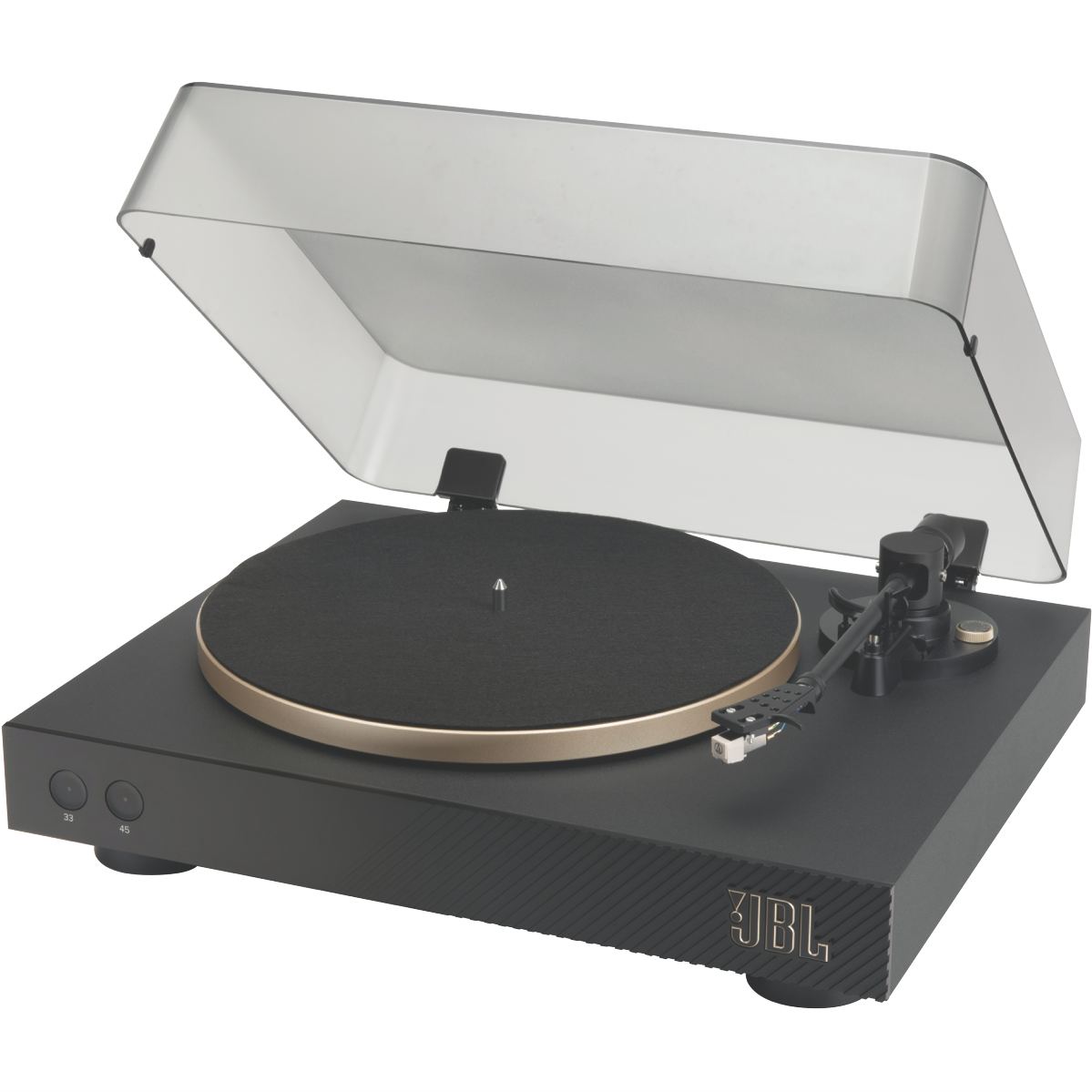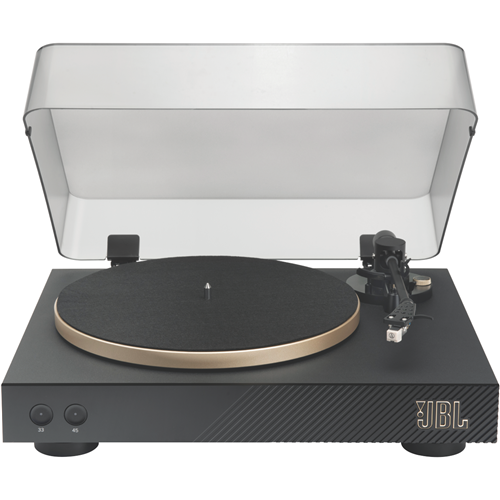 Spin your favorite vinyl in style with the JBL Spinner Bluetooth Turntable. This sleek belt-driven turntable lets you wirelessly stream music with Bluetooth 5.2 technology while maintaining the warm natural sound of vinyl. The high-quality aluminum tonearm and moving magnet cartridge produce rich audio from 33 1/3 and 45 RPM records. Convert your vinyl into digital files or listen to your streaming music services using the built-in phono preamp and Bluetooth connectivity. With a striking black and gold color scheme and compact footprint this versatile turntable adds vintage flair to any space. The manufacturer's part number for this product is 5785858. Check out the JBL Spinner Turntable to bring your vinyl into the modern era.