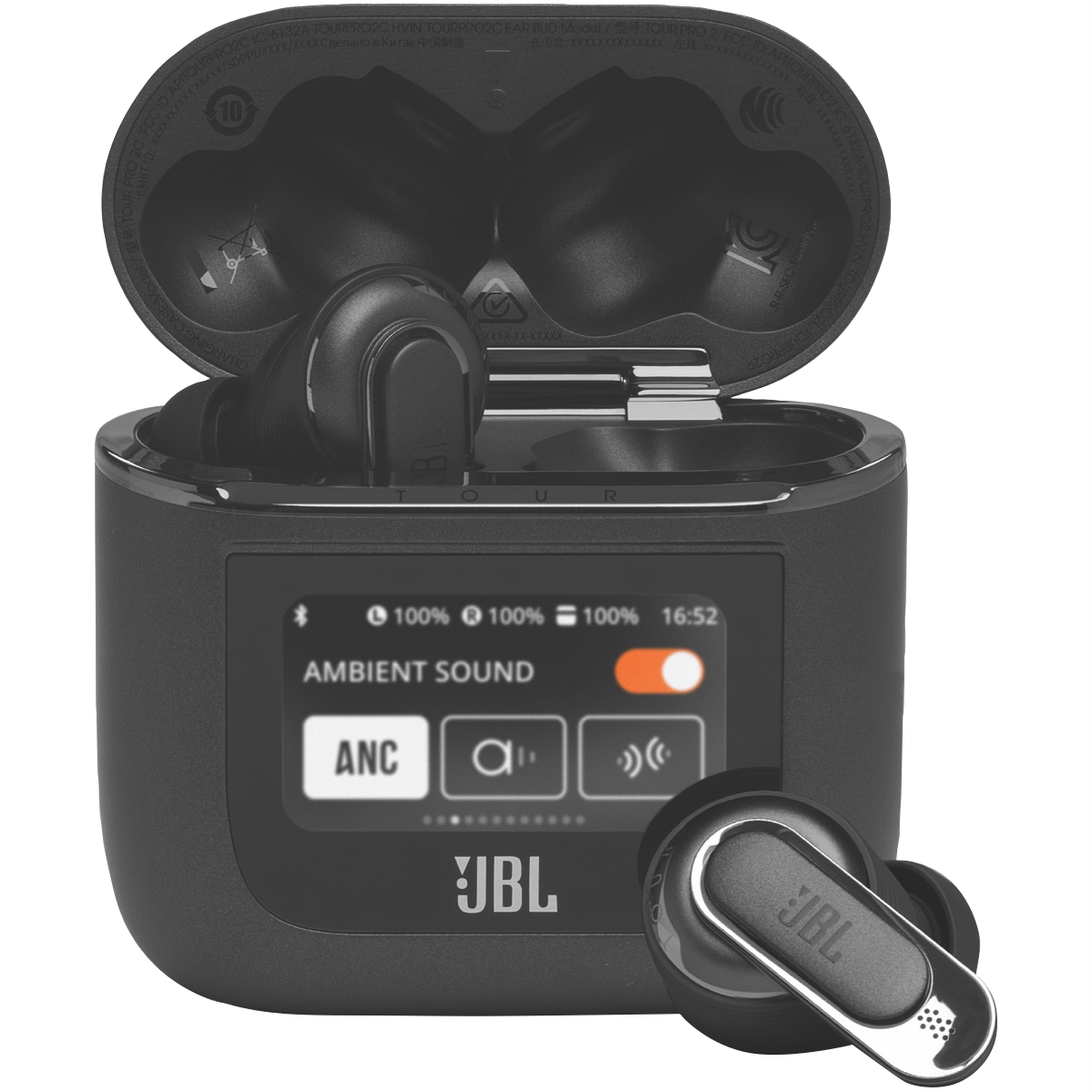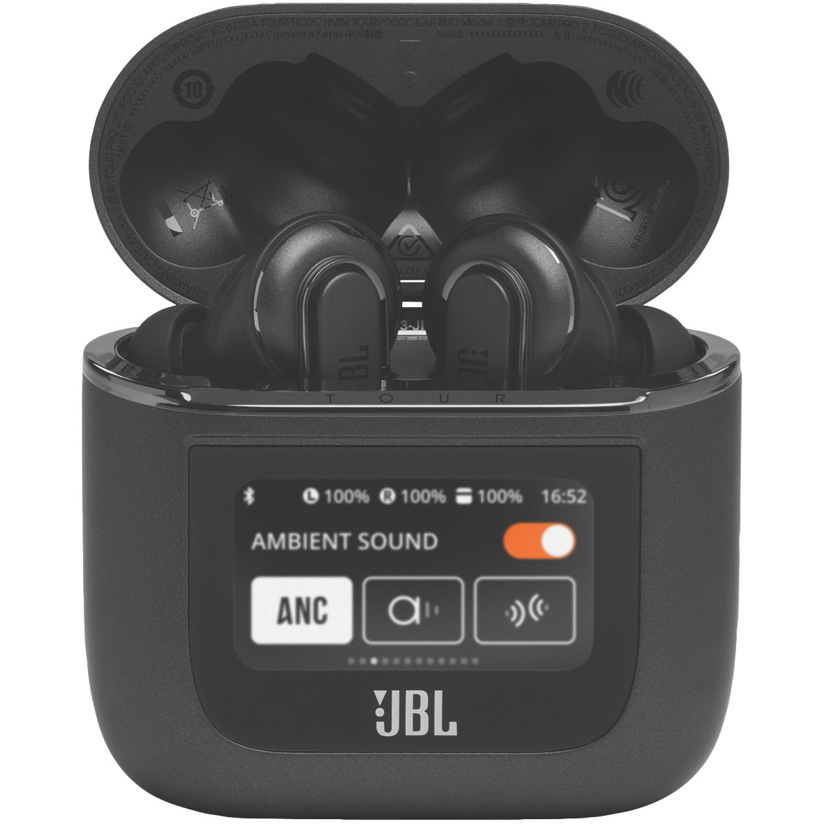 The JBL Tour Pro 2 s and Ture Wireless Noise cancelling earbuds. The unique smart charging case allows you to direct access all key earbuds features without using the smartphone App. All App features are accessible via the smart case even from non smartphone devices such as laptops PCs TVs etc. Control key JBL Headphones App features without using your phone simply touching the charging case screen 1.45-inch display for a truly seamless experience. Immerse yourself in spatial audio for up to 40 hours on a single charge thanks to the innovative Bluetooth-enabled smart charging case. The 6-mic technology ensures a superior call quality in any conditions. Turn on the Personal Sound Amplification to boost yours and others voice volume without ever removing your earbuds.