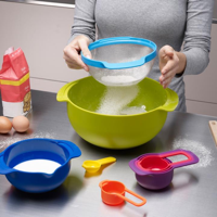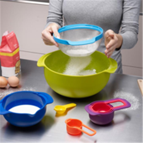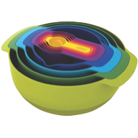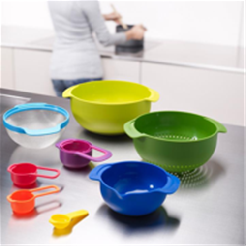 This innovative Joseph Joseph Nest 9 plus multi-colour food preparation bowl set features measuring tools that snap together neatly for storage. This space-saving set includes: 5 x measuring cups 1 x small non-slip mixing bowl 1 x stainless steel mesh sieve 1 x colander/strainer and 1 x large non-slip mixing bowl.