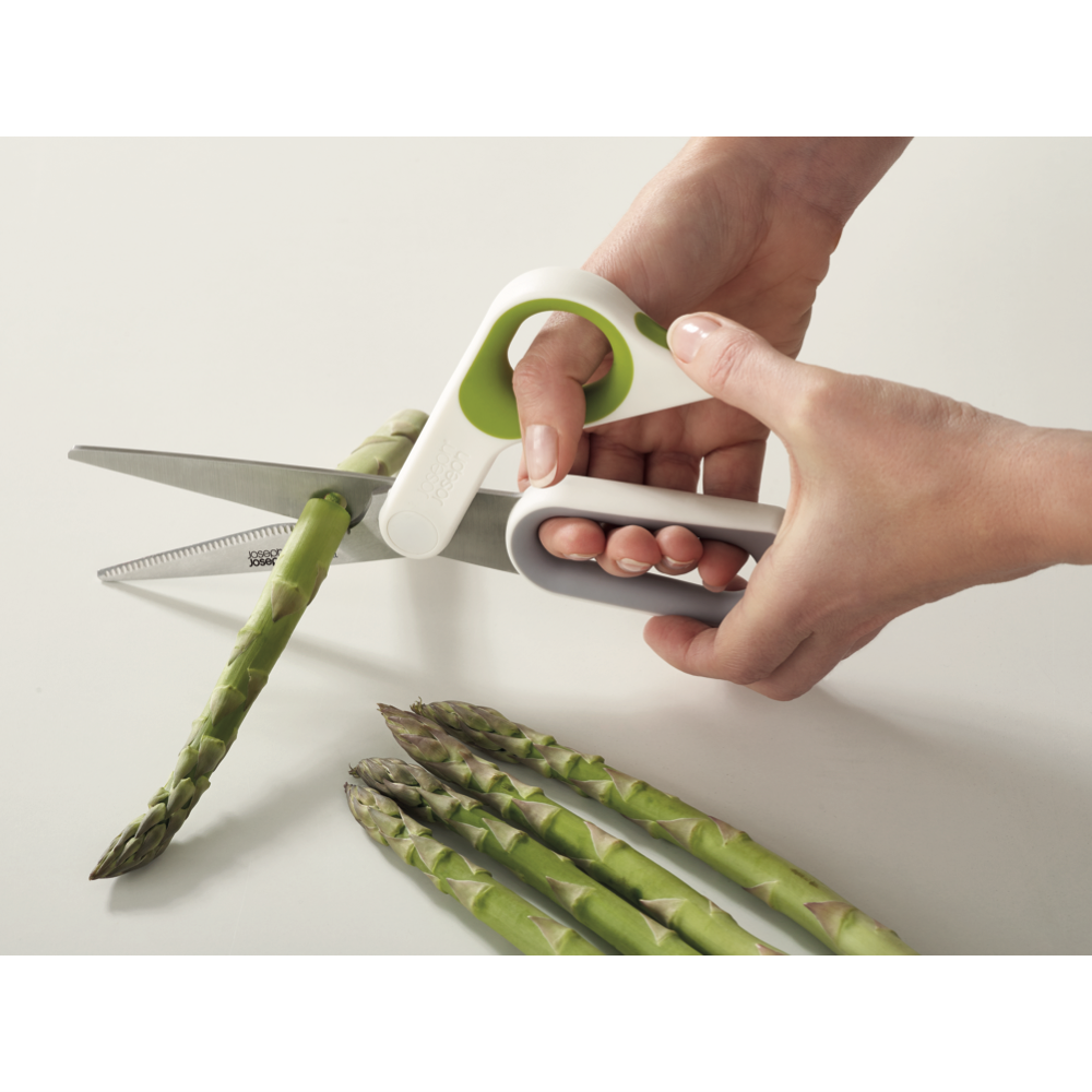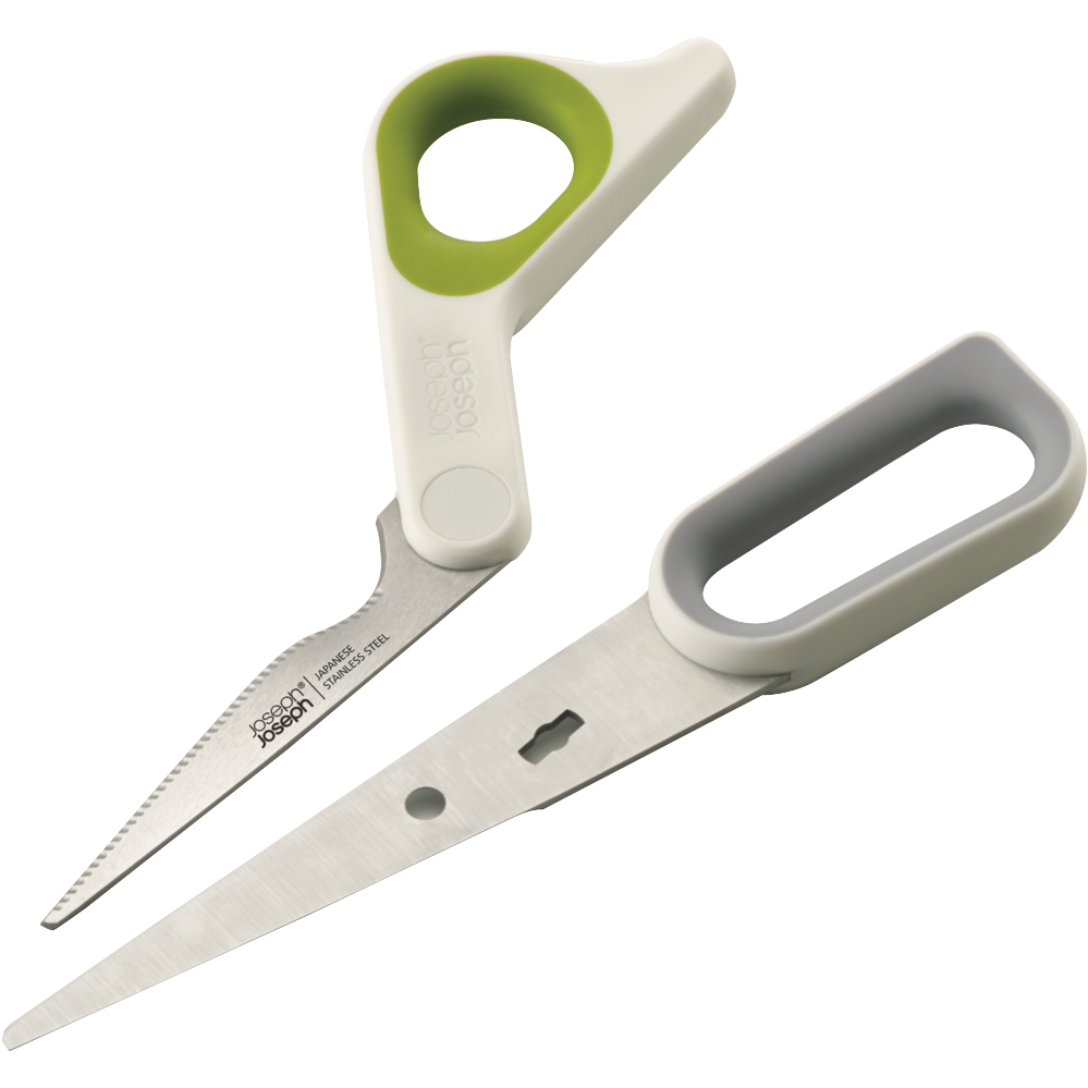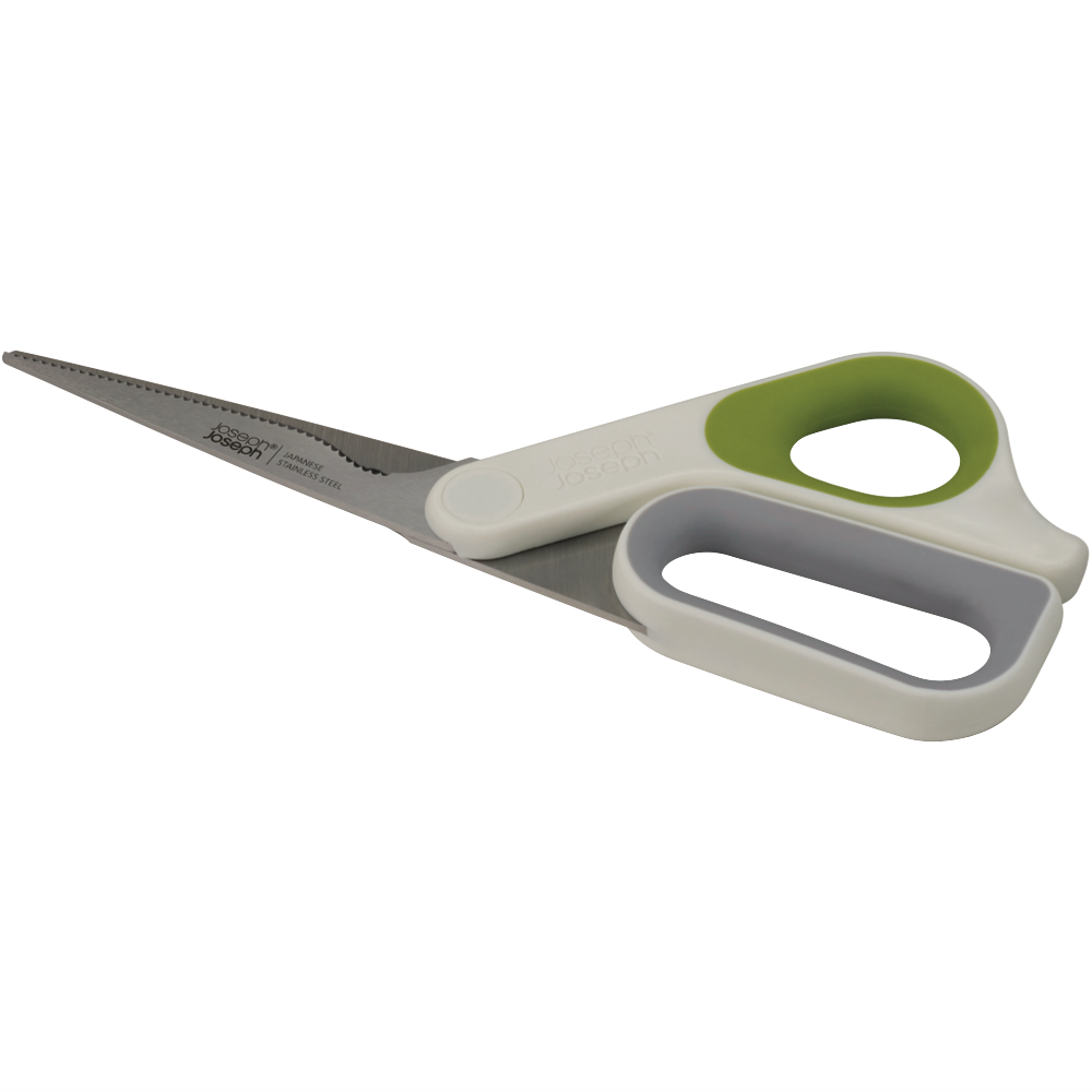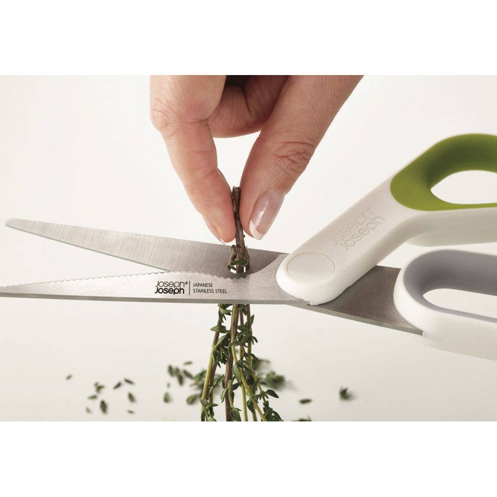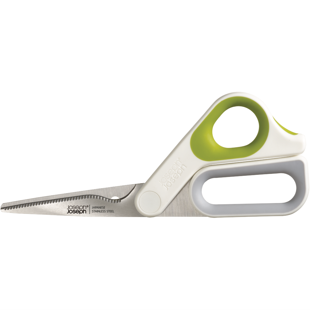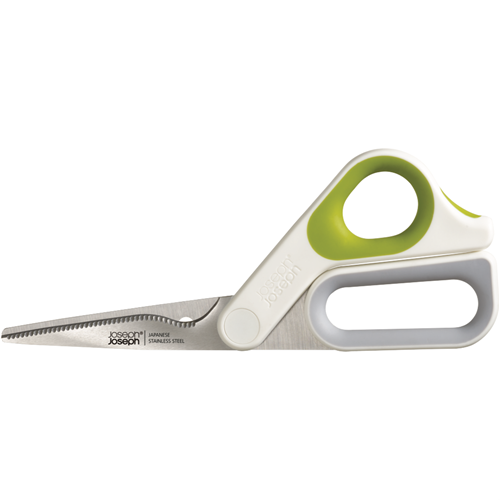 Bring precision and power to your kitchen with the Joseph Joseph PowerGrip Kitchen Scissors. These vibrant green and white scissors feature Japanese stainless steel blades with a handy serrated edge to slice through all kinds of foods with ease. The integrated thumb grip promotes control for two-handed use while the built-in herb stripper lets you quickly snip herbs and spices right over your dish. An integrated notch in the blade is perfect for cracking open shells or scoring meats before cooking. With a sleek ergonomic design these kitchen scissors provide exceptional durability and performance. The manufacturer's part number for this product is 10302. Add this essential versatile kitchen tool to your arsenal today.