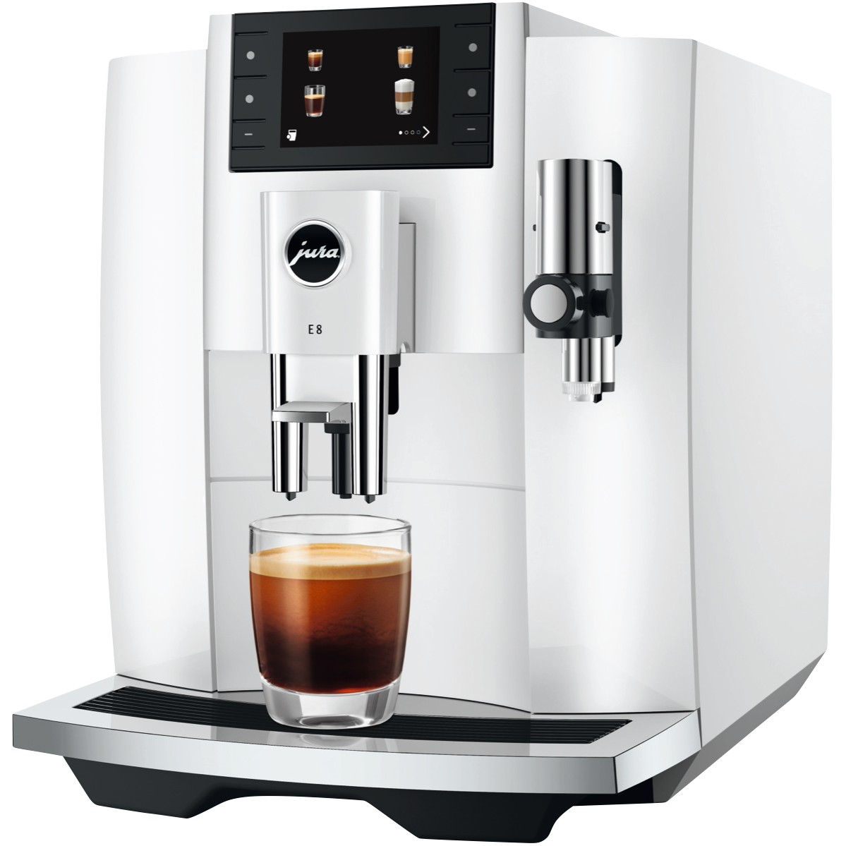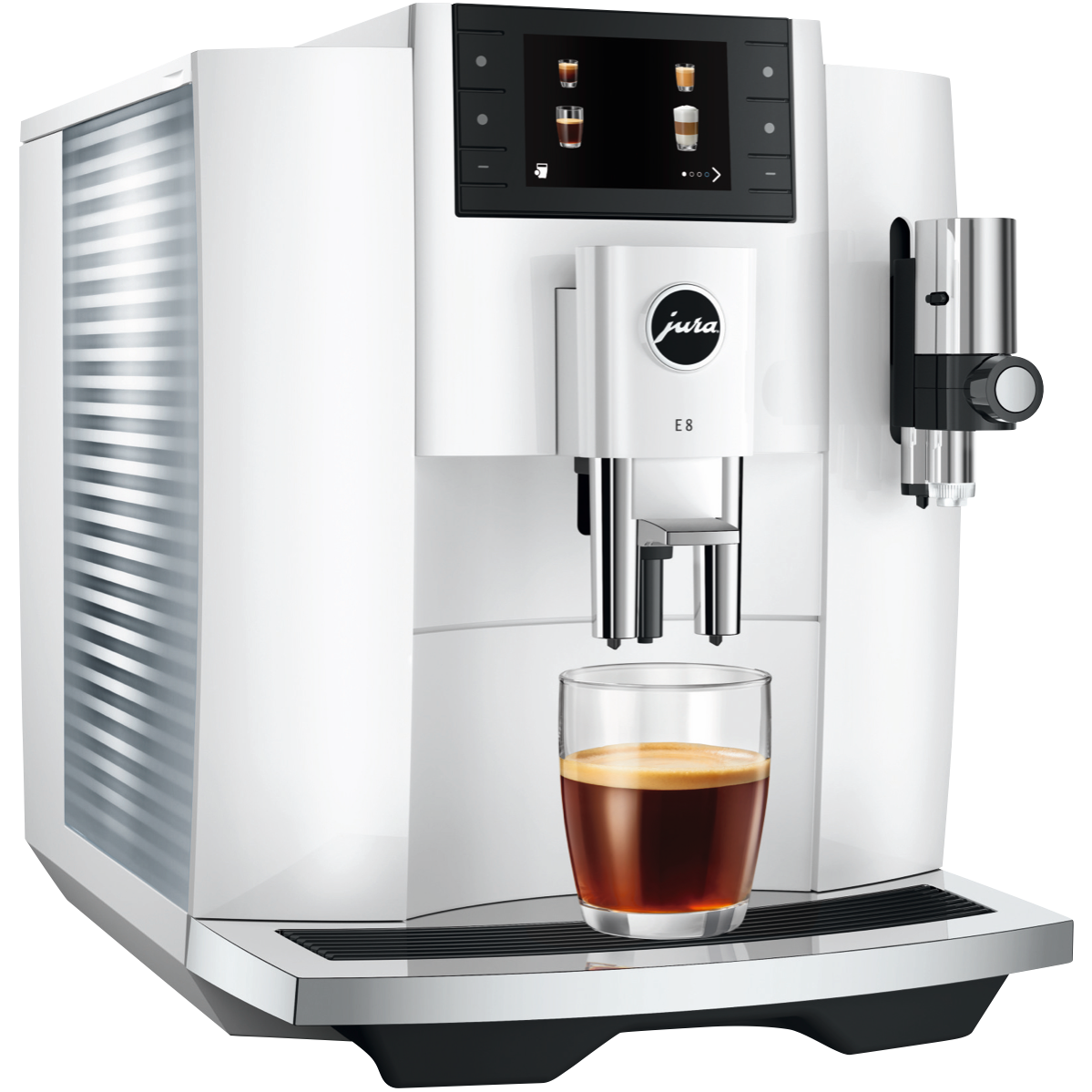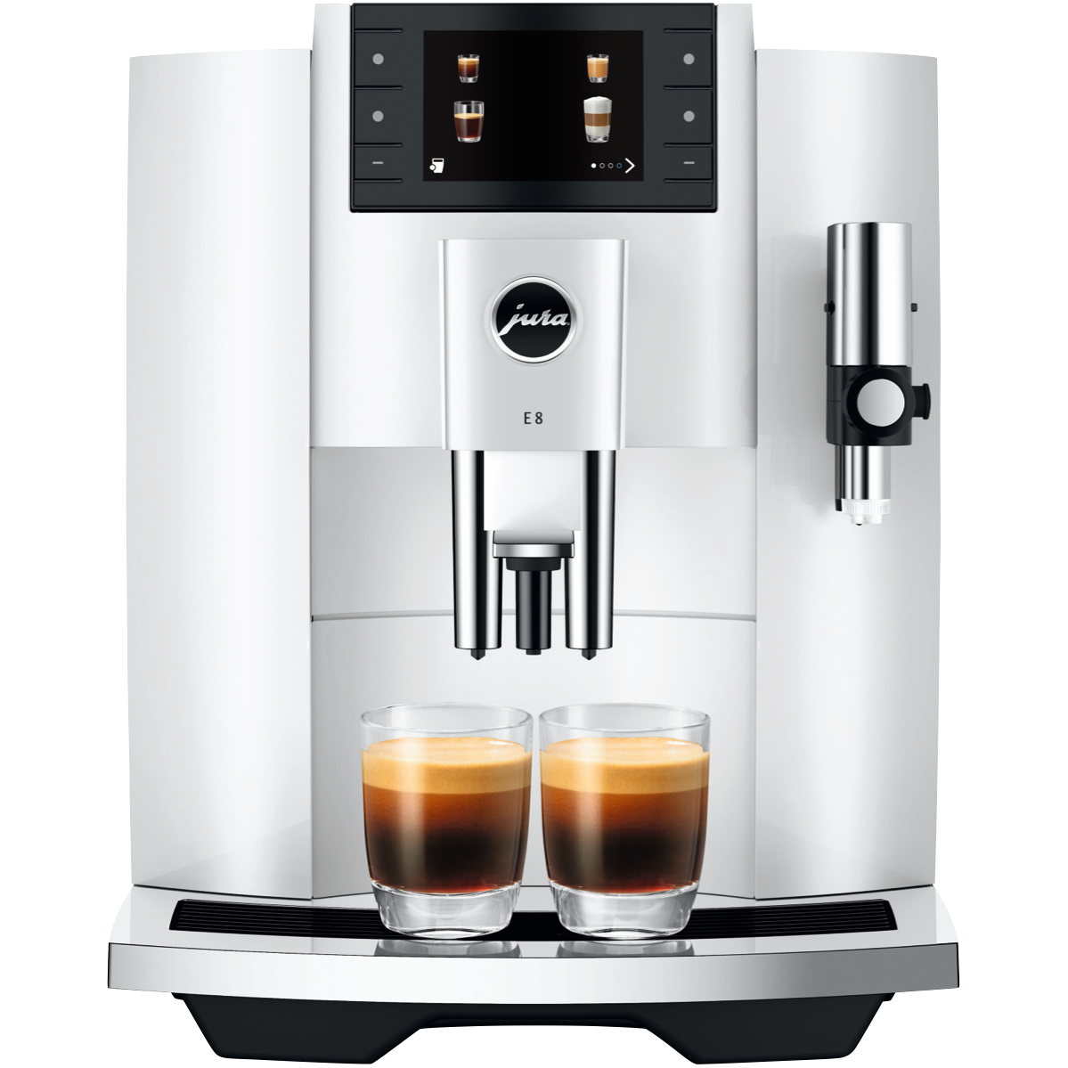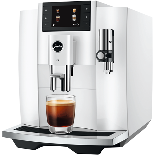 Discover the ultimate coffee experience with the JURA E8 INTC Piano White Coffee Machine. With intelligent preheating and precise 15 bar pump pressure this automatic coffee machine delivers barista-quality specialty coffees with ease. Its sleek piano white design houses advanced 3D brewing technology for full flavor extraction. Choose from 17 delicious coffee creations at the touch of a button. The built-in conical burr grinder with Pulse Extraction Process optimizes each cup while WiFi connectivity allows for convenient control via your smartphone. The 1.9L water tank and full-color display ensure minimal refills and effortless operation. With a height of 351mm depth of 446mm and width of 280mm this 10kg coffee machine fits perfectly on your countertop. Savor café-style coffee drinks in the comfort of home every morning. The manufacturer's part number for this product is 15662. Consider the JURA E8 for a sophisticated coffee experience.