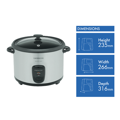 Cook fluffy delicious rice for the whole family with the Kambrook 10 Cup Rice Cooker. This stainless steel rice cooker lets you prepare perfect rice every time. With a generous 10 cup capacity you can cook rice for gatherings and meals throughout the week. The intuitive menu programs make cooking all varieties of rice simple. Just add rice and water select your settings and let the cooker do the work. The glass lid allows you to monitor cooking without releasing heat or moisture. When rice is done the cooker automatically switches to keep warm mode so your rice stays piping hot and ready to serve. The nonstick cooking bowl ensures easy cleanup. This versatile appliance can also be used to steam vegetables seafood or poultry. The sleek stainless steel exterior looks great on any countertop. With a 1 year warranty you can trust this rice cooker to deliver delicious fluffy rice for years to come. The manufacturer's part number for this product is KRC350BSS. Shop now and enjoy perfectly cooked rice anytime.