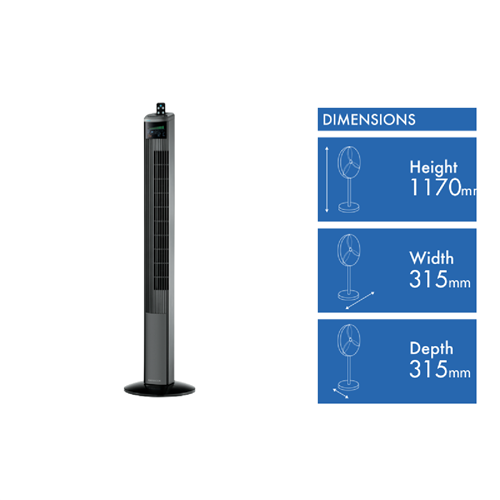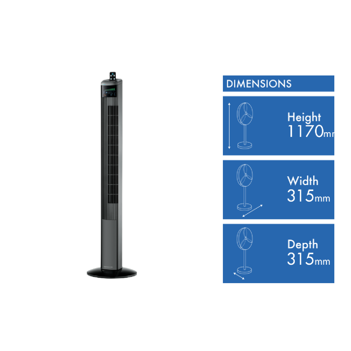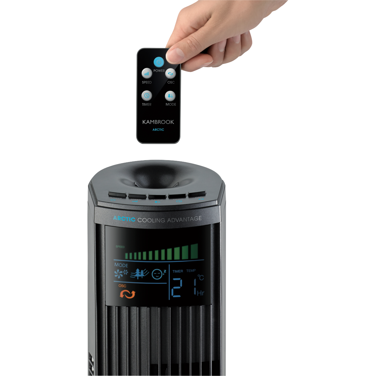 Cool comfort and contemporary style are yours with the Kambrook 116cm Arctic LED Display Tower Fan. This sleek grey tower fan features 3 speed settings and quiet operation for customized cooling. The 72° oscillation ensures wide coverage to circulate air throughout your space. LED display and remote control allow easy adjustment from anywhere in the room. Standing 1170mm tall with a 315mm width and depth this slim fan takes up minimal floor space. The 1 year warranty provides peace of mind with this quality purchase. The manufacturer's part number for this product is KFA839GRY. Discover the cooling power and stylish design of the Kambrook Arctic Tower Fan today.