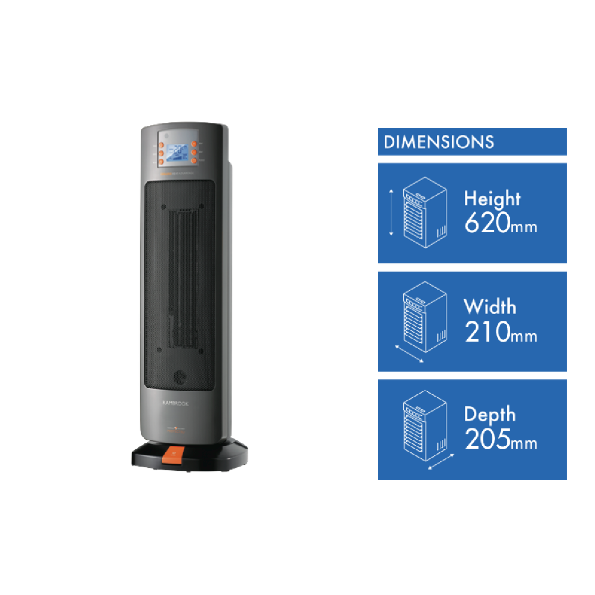 Escape the winter chill and warm your home in style with the Kambrook 2000W Grey Ceramic Tower Heater. This sleek portable electric heater provides powerful heating for large rooms with 2000W of power and two heat settings to customize your comfort. The programmable 8-hour auto-off timer allows you to control heating times while the thermostat maintains your desired temperature. Safety is also a priority with tip-over auto shut-off to prevent accidents. The smooth ceramic heating element distributes warmth evenly for efficient heating without hotspots. The digital LCD display allows easy monitoring of settings and the convenient rear carry handle provides portability around the home. With a height of 620mm and 210mm width the tower design is an attractive addition to any living space. Experience the cozy warmth and modern style of the Kambrook Ceramic Tower Heater this winter. The manufacturer's part number for this product is KCE340GRY. Get yours today for convenient home heating all season long.