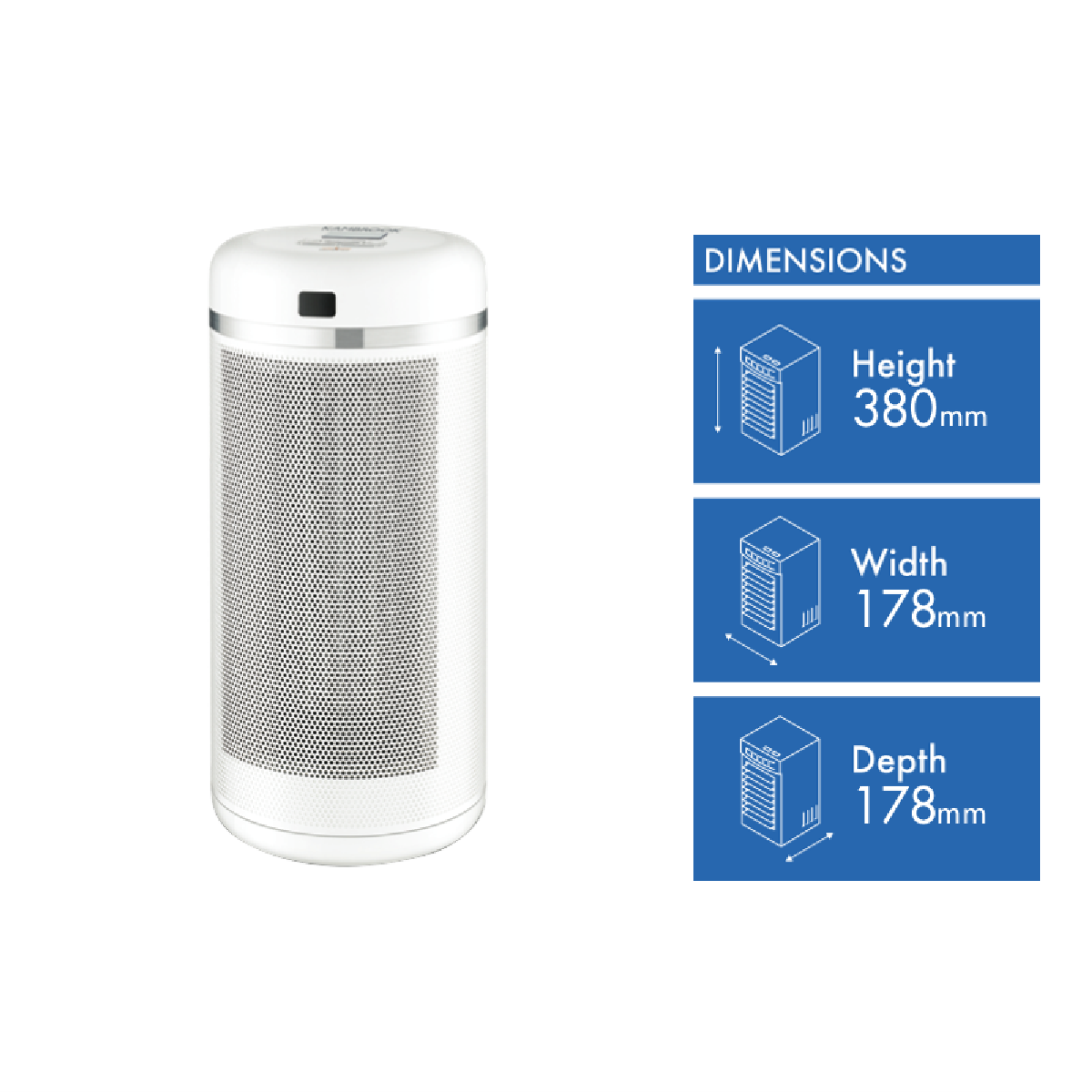 Control the temperature in your home with the Kambrook 2000W White Ceramic Tower Heater. This portable electric ceramic heater provides comforting warmth with its 2000 watt heating power and two heat settings allowing you to adjust the temperature to your desired level. The programmable 8 hour auto-off timer enables you to set the heater to turn off automatically for added safety and convenience. Standing 380mm tall with a 178mm width and depth this lightweight 2.6kg heater can be easily moved room to room. Safety features include a tip over cut out switch that will power off the unit if knocked over accidentally. With its brilliant white finish this Kambrook heater will seamlessly blend into modern home decor. Experience reliable performance with the 1 year manufacturer's warranty. The manufacturer's part number for this product is KCE460WHT. Learn more about the Kambrook 2000W White Ceramic Tower Heater and warm your home in style this winter.