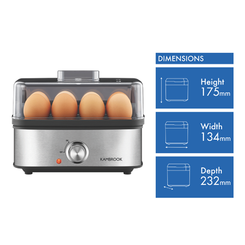 Cook up to 8 eggs your way with the versatile Kambrook 3 Way Compact Egg Cooker. This 400 Watt egg cooker lets you prepare soft medium or hard boiled eggs using the egg rack. The separate poaching tray can poach 3 eggs at once or make 3 mini omelettes. An audible buzzer notifies when your eggs are ready so you don't have to watch the clock. The BPA-free dishwasher-safe lid egg rack and poaching tray make cleanup a breeze. With a compact and lightweight design this egg cooker is easy to store and perfect for small kitchens or taking on trips. The included water measuring cup with egg piercing pin and safety cap provide added convenience. Give your morning routine an upgrade with perfectly cooked eggs using this time-saving kitchen appliance. The manufacturer's part number for this product is KEG655BSS2JAN1. Check out the Kambrook 3 Way Compact Egg Cooker today for effortlessly cooked eggs.