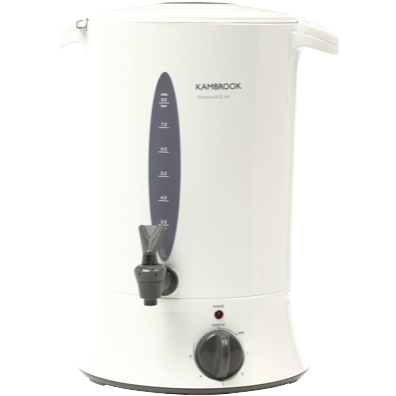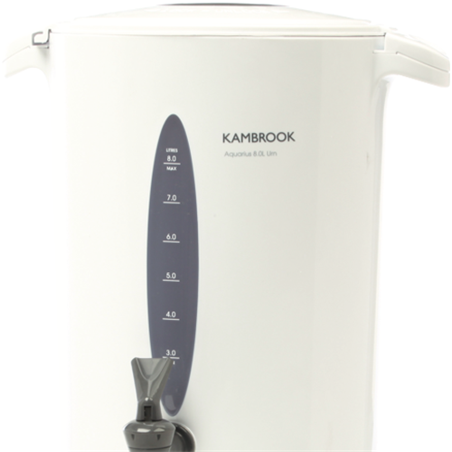 This 1800 watt Kambrook 8 litre domestic urn in white plastic is ideal for keeping water hot for tea coffee or beverages. With variable temperature control you can adjust the heat to suit your needs. The non-drip tap with two way flow lever allows for easy pouring without drips or spills. Cool touch carry handles let you move the urn safely. A water level indicator water window and slow release lid make it easy to monitor the water level and refill when needed. At 320mm high 240mm wide and 410mm deep this 3kg urn will fit nicely on your counter top. The keep warm function maintains your desired temperature while the auto shut off provides safety. With a sleek modern design this urn provides hot water on demand for gatherings large and small. The manufacturer's part number for this product is KUR10. Give your kitchen a stylish update with this versatile urn..