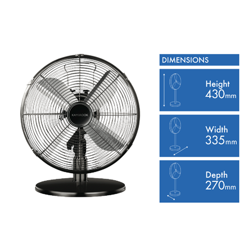 Cool down and refresh your personal space with the Kambrook Arctic Antique Metal Desk Fan. This desktop fan comes with a tilt adjustable 30cm antique metal blade and base that will add a touch of vintage flair to any desk or tabletop. With 3 speed settings you can adjust the airflow to your liking. Measuring 210mm wide 245mm high and 350mm deep its compact size makes it easy to position in any room. The tilt adjustable head allows you to direct the breeze exactly where you need it. Designed for reliability this fan comes with a 1 year manufacturer's warranty. The Kambrook Arctic fan is the perfect choice for cooling yourself down and adding some antique styling to your home office or workspace. Its antique metal finish and tilt adjustable head provide both form and function. This fan's size and features make it ideal for desktop use. Check out the Kambrook Arctic Desk Fan if you are looking for a compact vintage-inspired fan to keep you comfortable while you work. The manufacturer's part number for this product is KFA241. Explore the features and vintage styling of the Kambrook Arctic Desk Fan today.