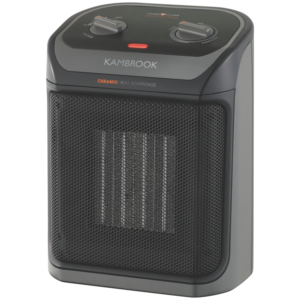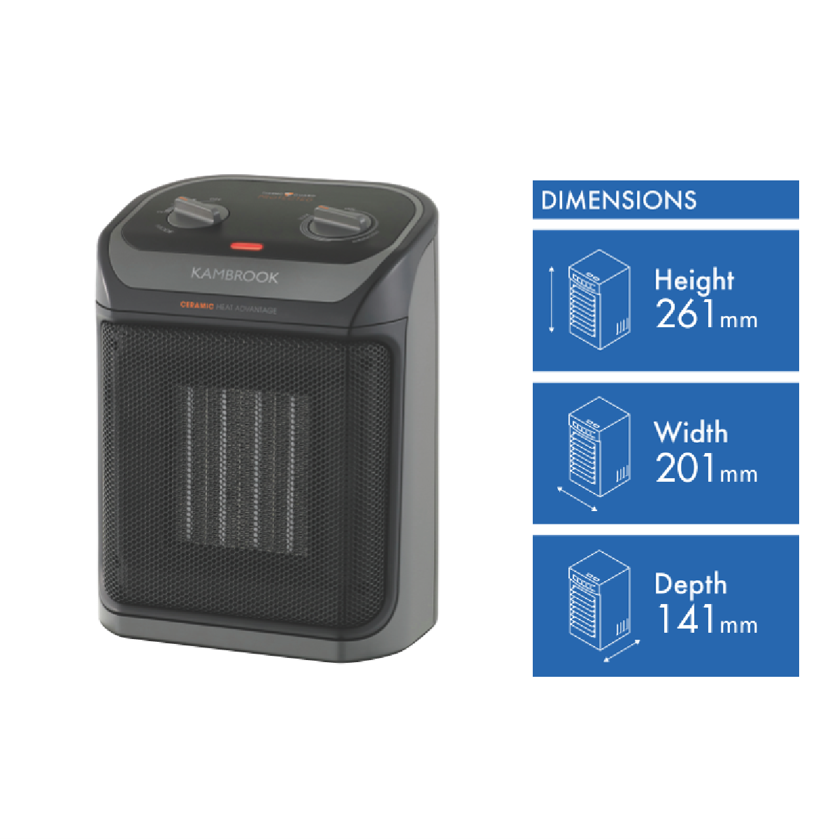 Warm up your home this winter with the Kambrook PERSONAL CERAMIC HEATER. This 1800W portable electric heater is perfect for adding extra heat to any room. With a sleek black design and carry handle you can easily move it between the living room bedroom or office. It features two heat settings and a fan only option so you can customize the temperature output. The variable thermostat gives you precise control over the heat. For safety it has a tip-over cut off switch that will turn the unit off if accidentally knocked over. And it comes with a 1 year warranty from Kambrook for added peace of mind. With a compact 201mm width 261mm height and 141mm depth it won't take up much space. The ceramic heating element allows for more efficient heating than traditional bar heaters. Give your rooms an instant boost this winter with the Kambrook PERSONAL CERAMIC HEATER. The manufacturer's part number for this product is KCE85. Add portable warmth to your home today.