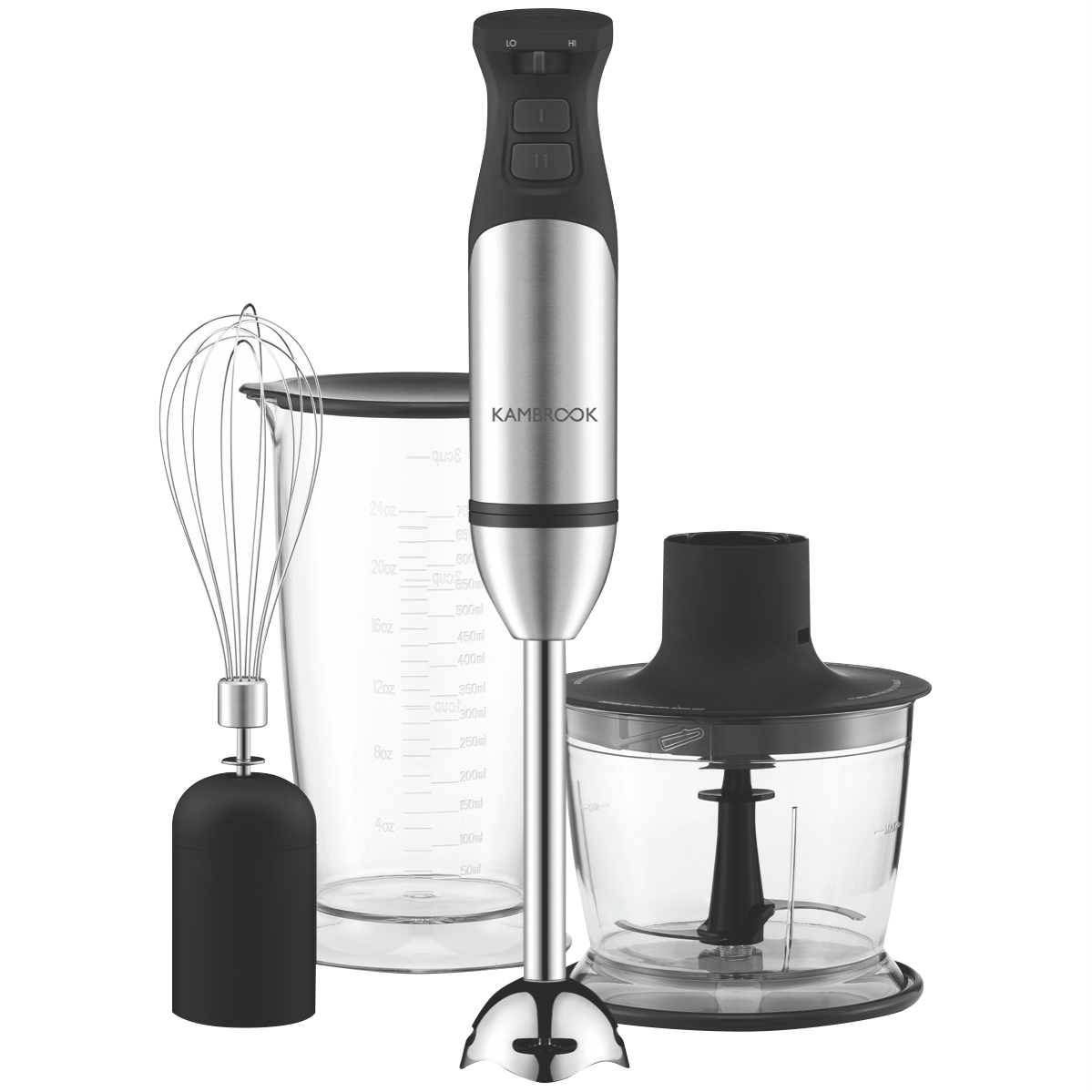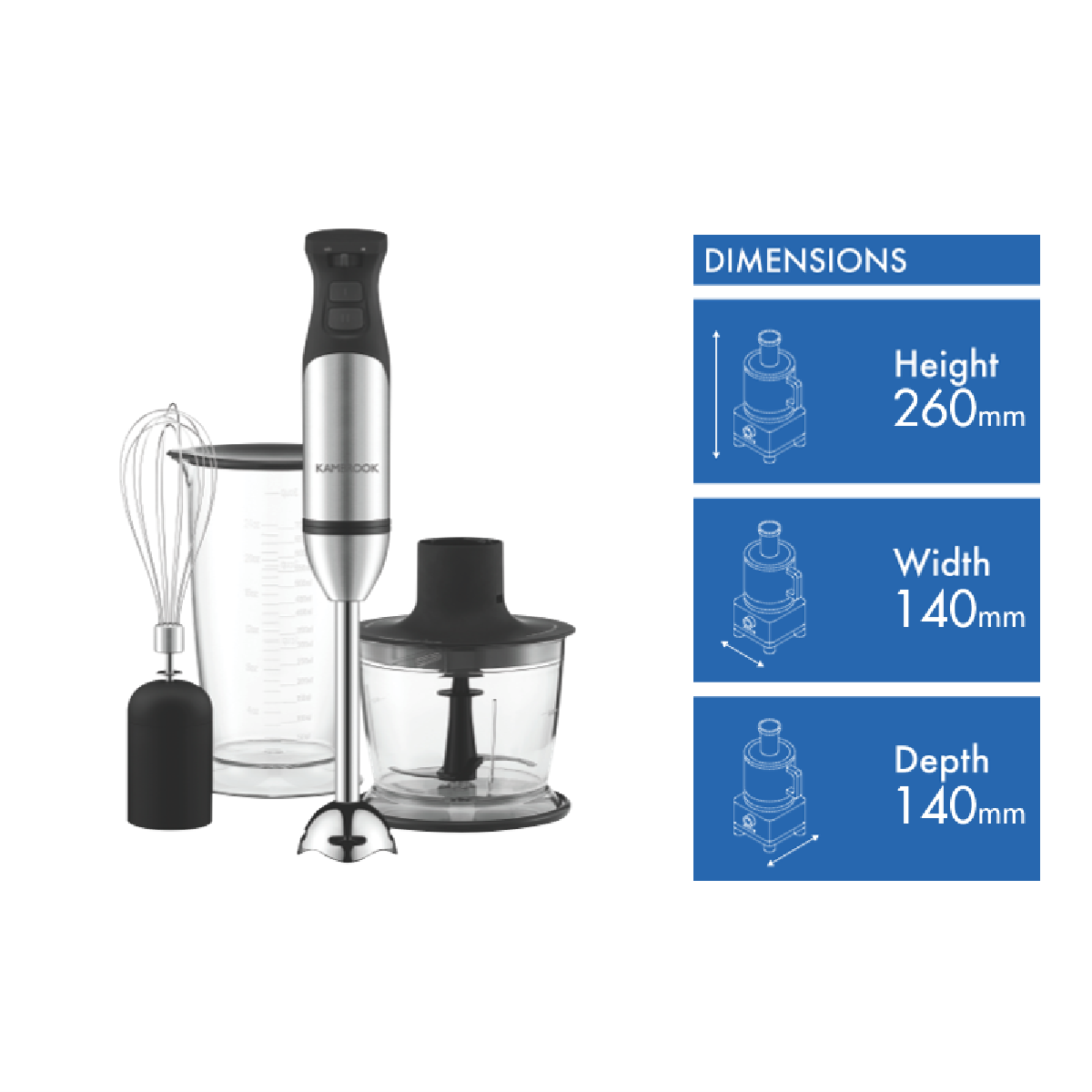 Additional Features Quiet DC Motor, 700ml measuring %26amp; blending jug with storage lid, Stainless steel blending wand %26amp; whisk, Chopping bowl anti-slip base converts to a lid