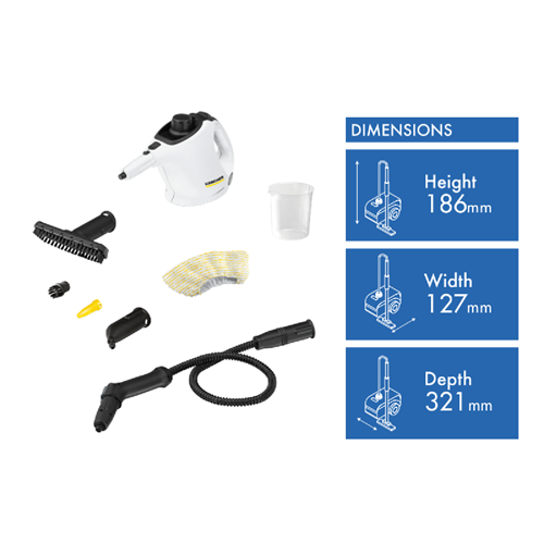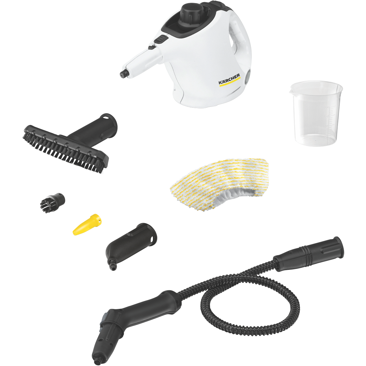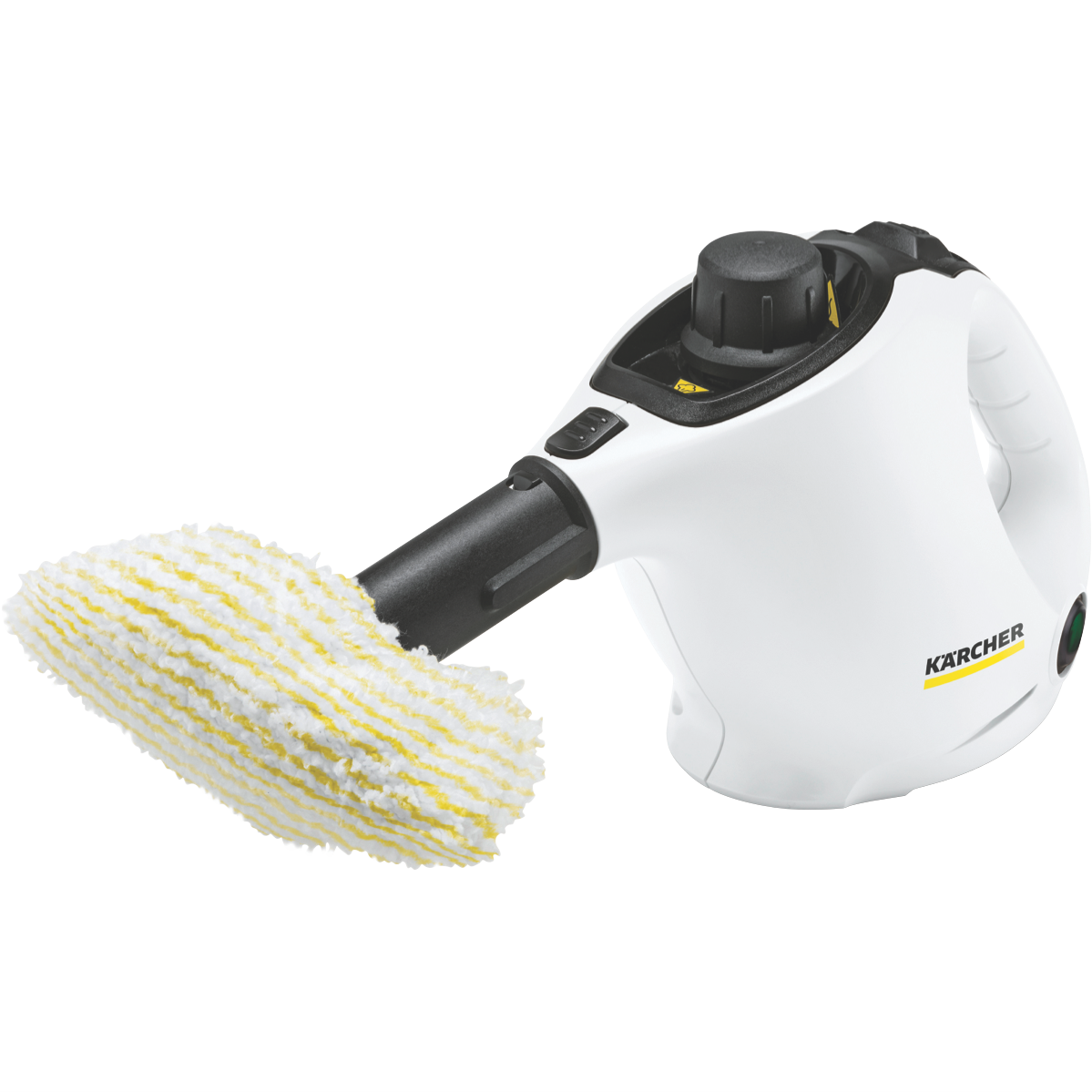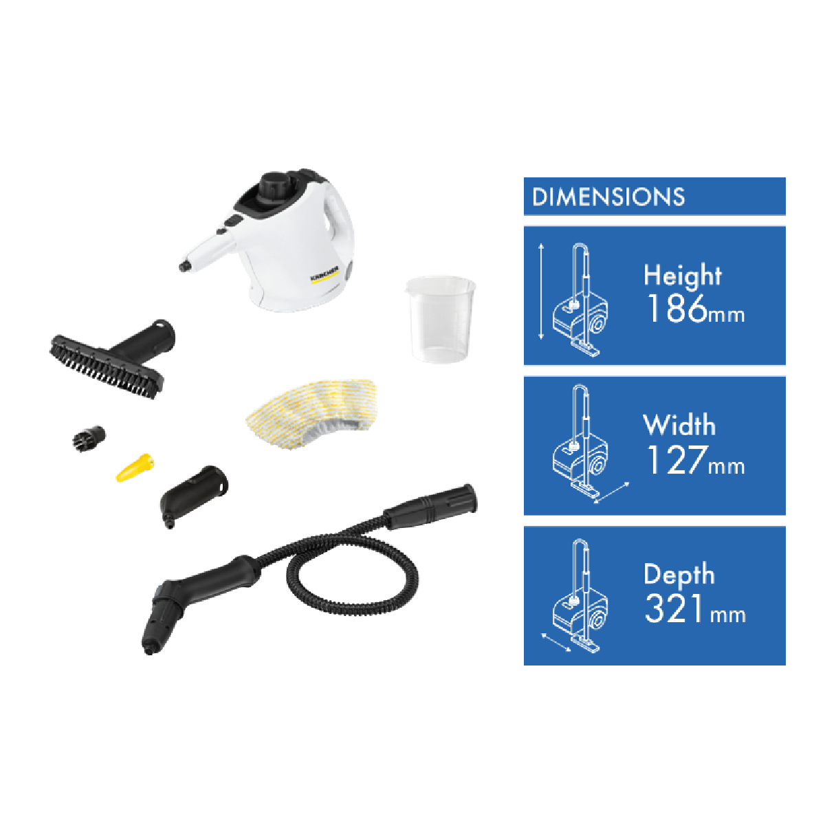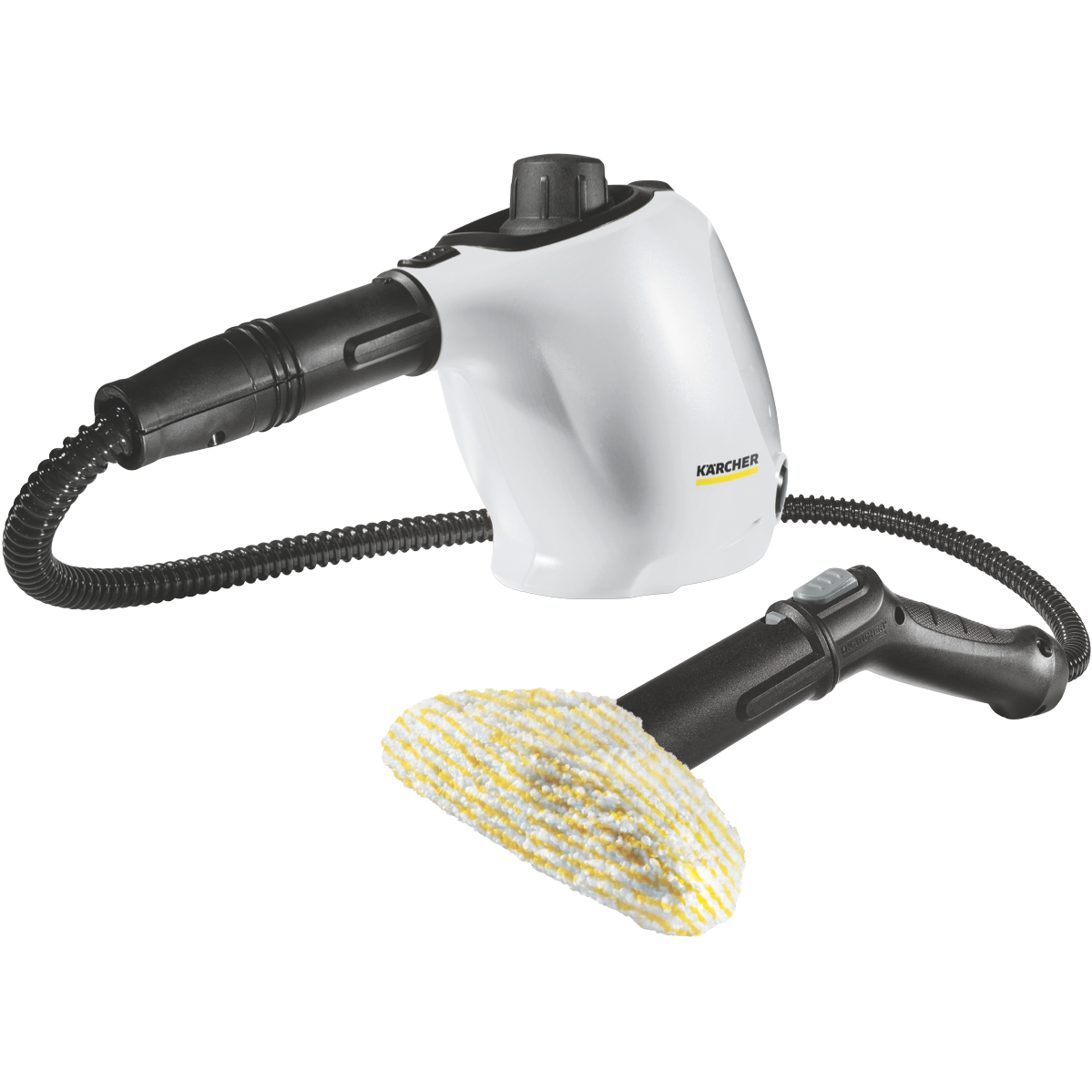 Tackle dirt and grime with ease using the powerful Karcher SC1 Handheld Steam Cleaner. This compact white steam cleaner delivers professional cleaning results in your home eliminating 99.99% of germs with its pressurized hot steam. The lightweight handheld design weighs only 1.58kg making it easy to maneuver into tight spaces like sinks taps and tile grout. Blast away grease soap scum and bacteria from wash basins wall tiles windows mirrors stove hoods and more in mere seconds. With rapid 3 minute heat-up and pressure of 3.0 Bar the SC1 blasts hot steam through the included detail nozzle hand tool round brush and extension hose. The 0.2L tank capacity offers up to 11 minutes of continuous steam cleaning. Safety features like the child lock and pressure release valve allow for safe operation. This versatile steam cleaner sanitizes and freshens sealed hard surfaces throughout your home. Reduce chemical usage with the green cleaning power of steam. Karcher's 2 year warranty provides peace of mind. The manufacturer's part number for this product is 1.516-453.0.