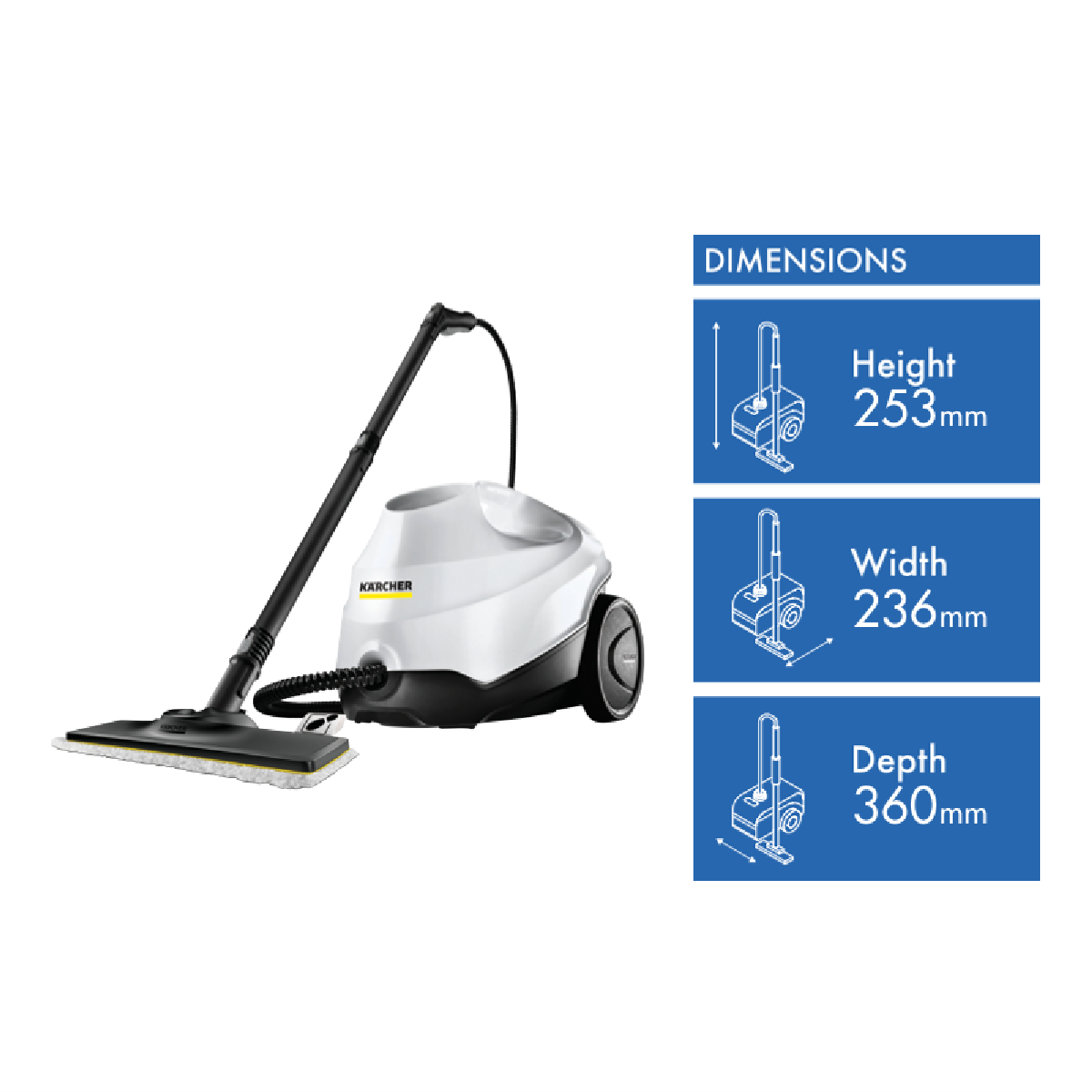 Say goodbye to stubborn dirt and grime with the Karcher SC3 Steam Cleaner. This powerful cleaner makes light work of floors taps wash basins wall tiles windows and mirrors. With a generous 1L tank capacity and a 4m hose you can tackle larger cleaning jobs without constant refills. The childproof safety lock gives you peace of mind while the 2-year manufacturer's warranty ensures long-lasting performance. Karcher's 1.513-658.0 model is your reliable partner for a spotless home.