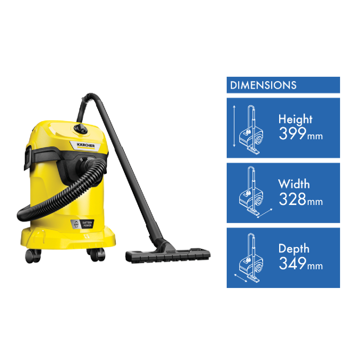 Make cleaning up around the home a breeze with the Karcher WD 3-18 Wet and Dry Vacuum. This versatile vacuum handles both wet and dry messes with its large 17 litre tank capacity perfect for picking up dust and dirt as well as sucking up spills. The cordless design provides freedom to manoeuvre into tight spaces and hard to reach areas. Weighing only 2.2kg it s lightweight and easy to carry up and down stairs or from room to room. The lithium ion battery enables up to 35 minutes of continuous vacuuming on a full charge. With its compact size and bagless design the Karcher is convenient to empty and store away. Equipped with a blower function it quickly clears leaves grass and debris from outdoor spaces. Experience the convenience of quick and effortless cleanups with this wet and dry vac. Backed by a 2 year Karcher warranty for peace of mind. Manufacturer's part number 1.628-550.0.